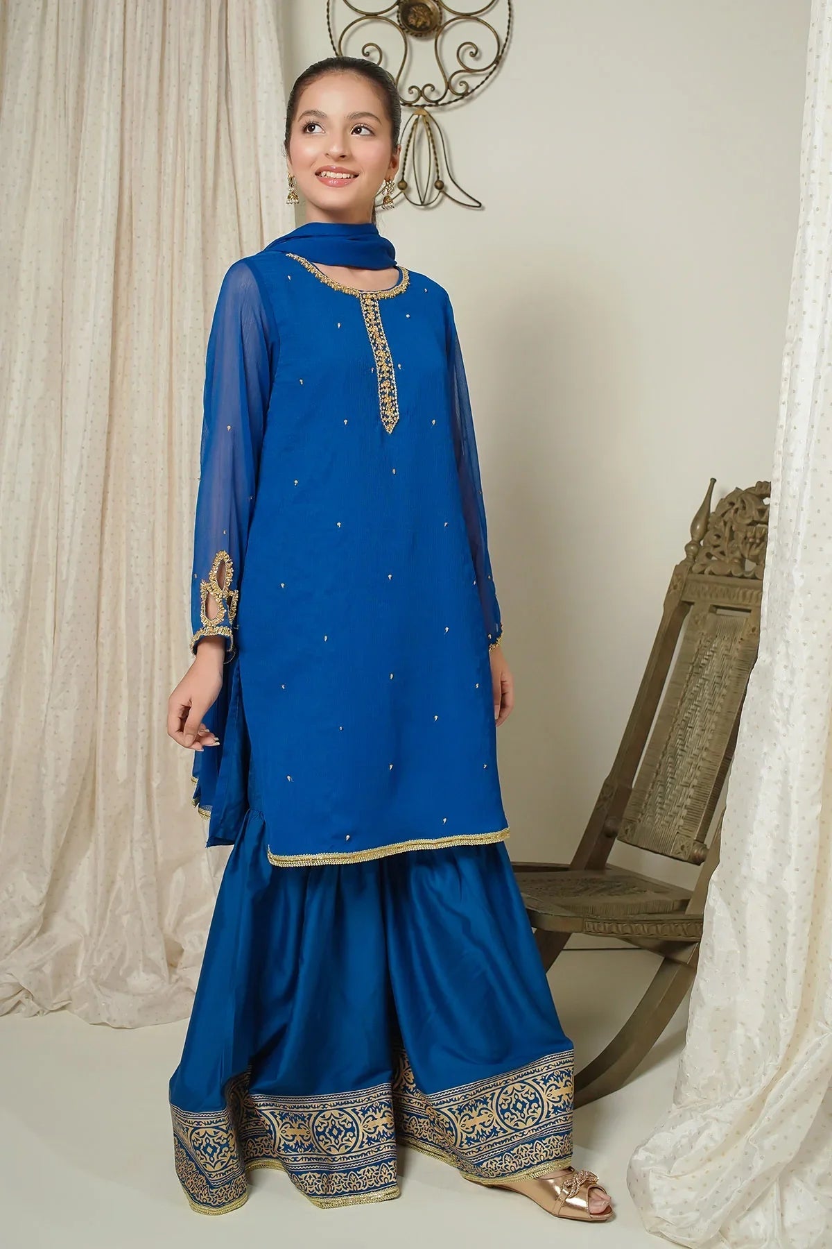 Bottom: Teal Blue Malai Crepe Gharara Pants with Print and Lace