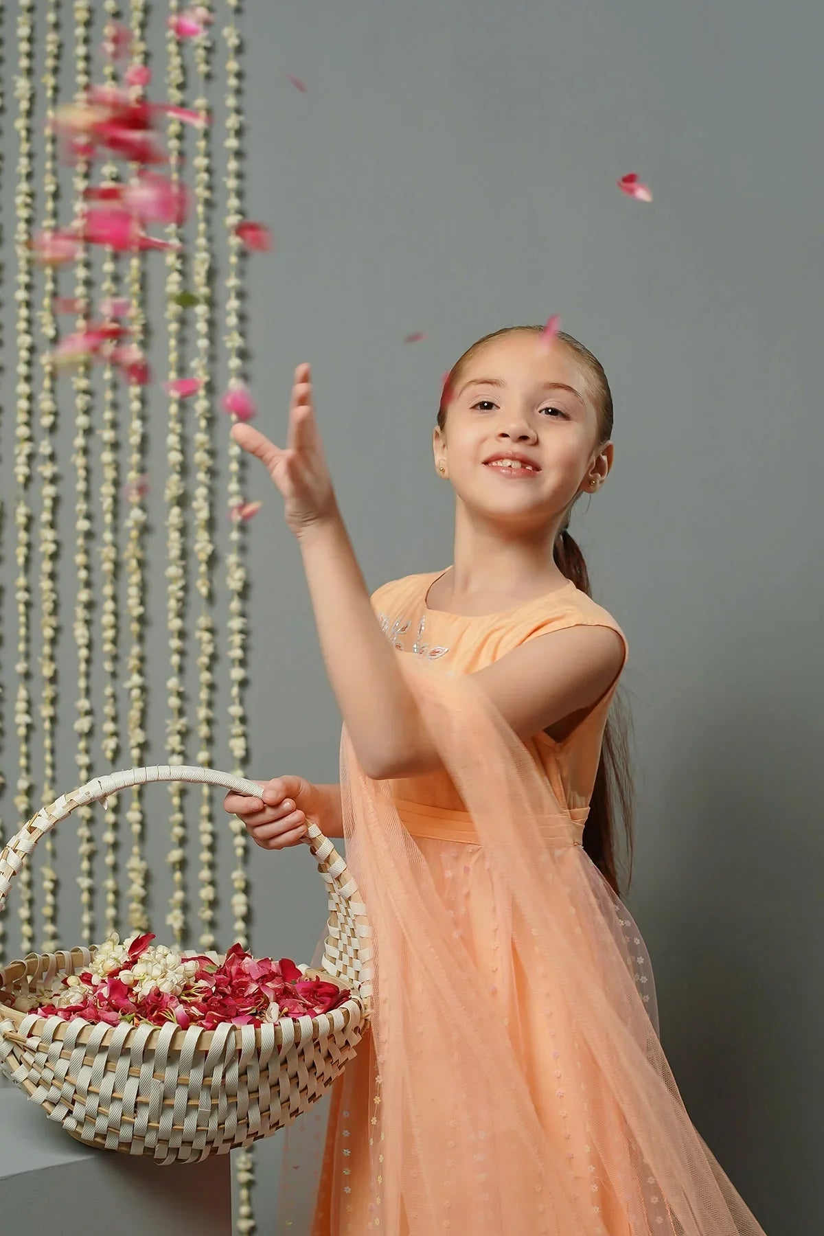 "Top: Peach Sequence Net Maxi with Hand Adda Work and Malai Crepe Lining