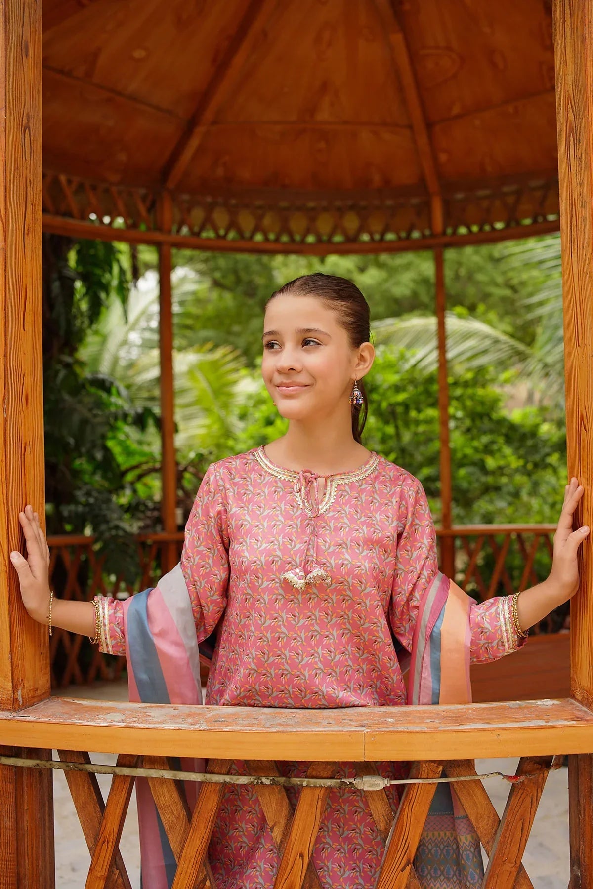 Top: Pink Herringbone Digital Printed Kurta with Laces and Tassels