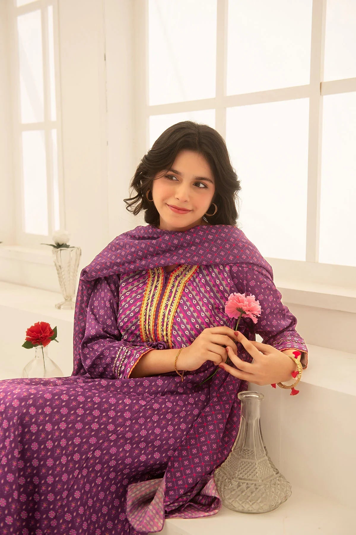 "Top: Purple Herringbone Digital Printed Kurta with Laces