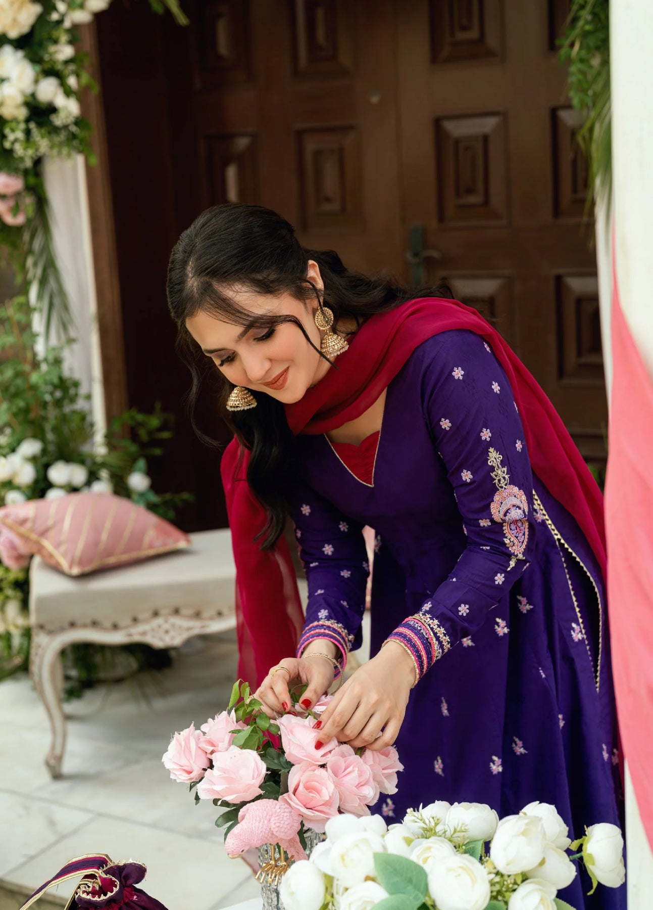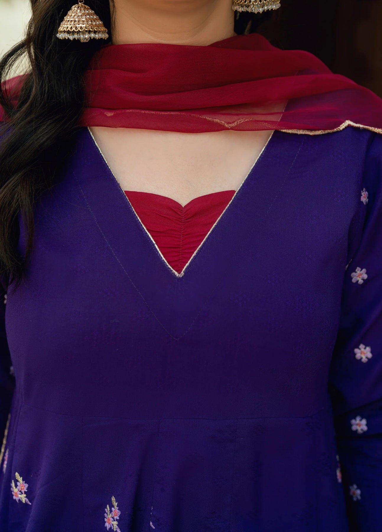 Color: Purple Fabric of shirt: Dobby Fabric of dupatta: Chiffon Fabric of trouser: cotton silk Model Height: The model is 5'5 and wears a small size.