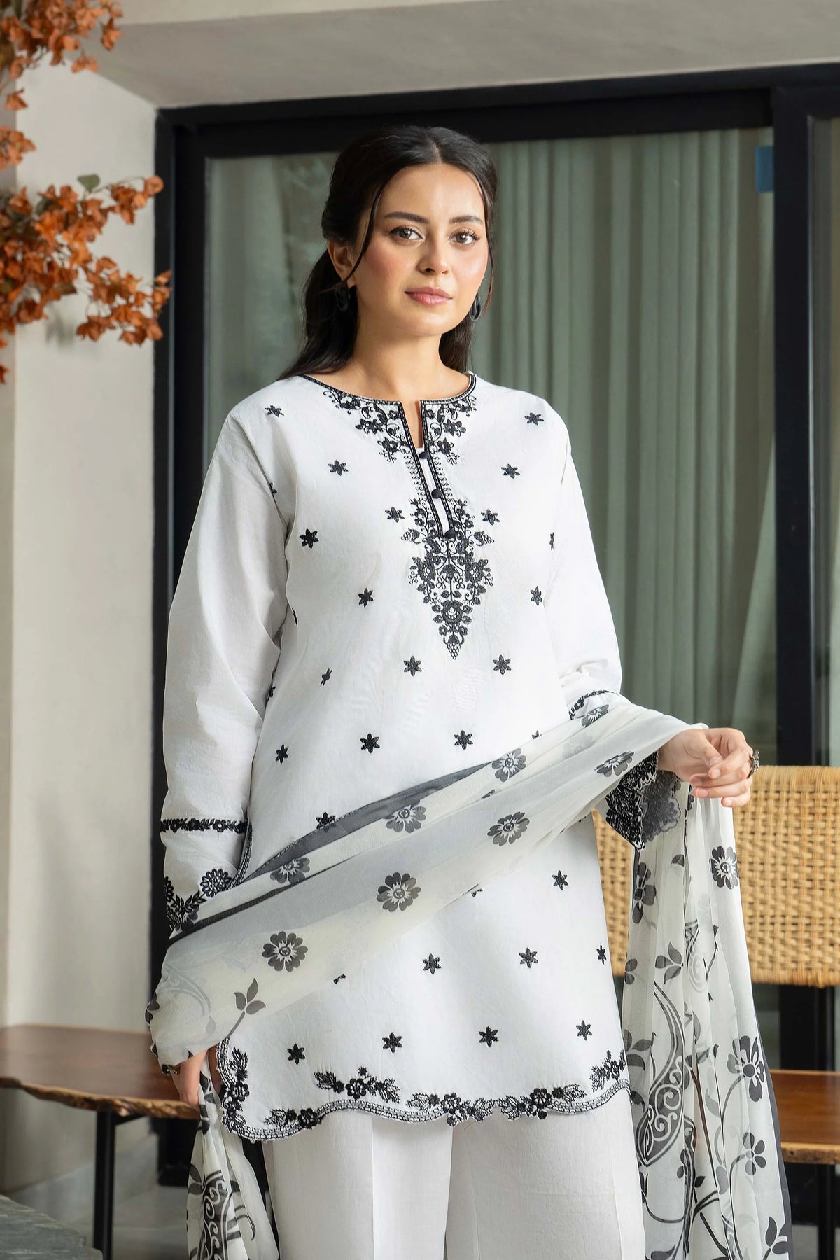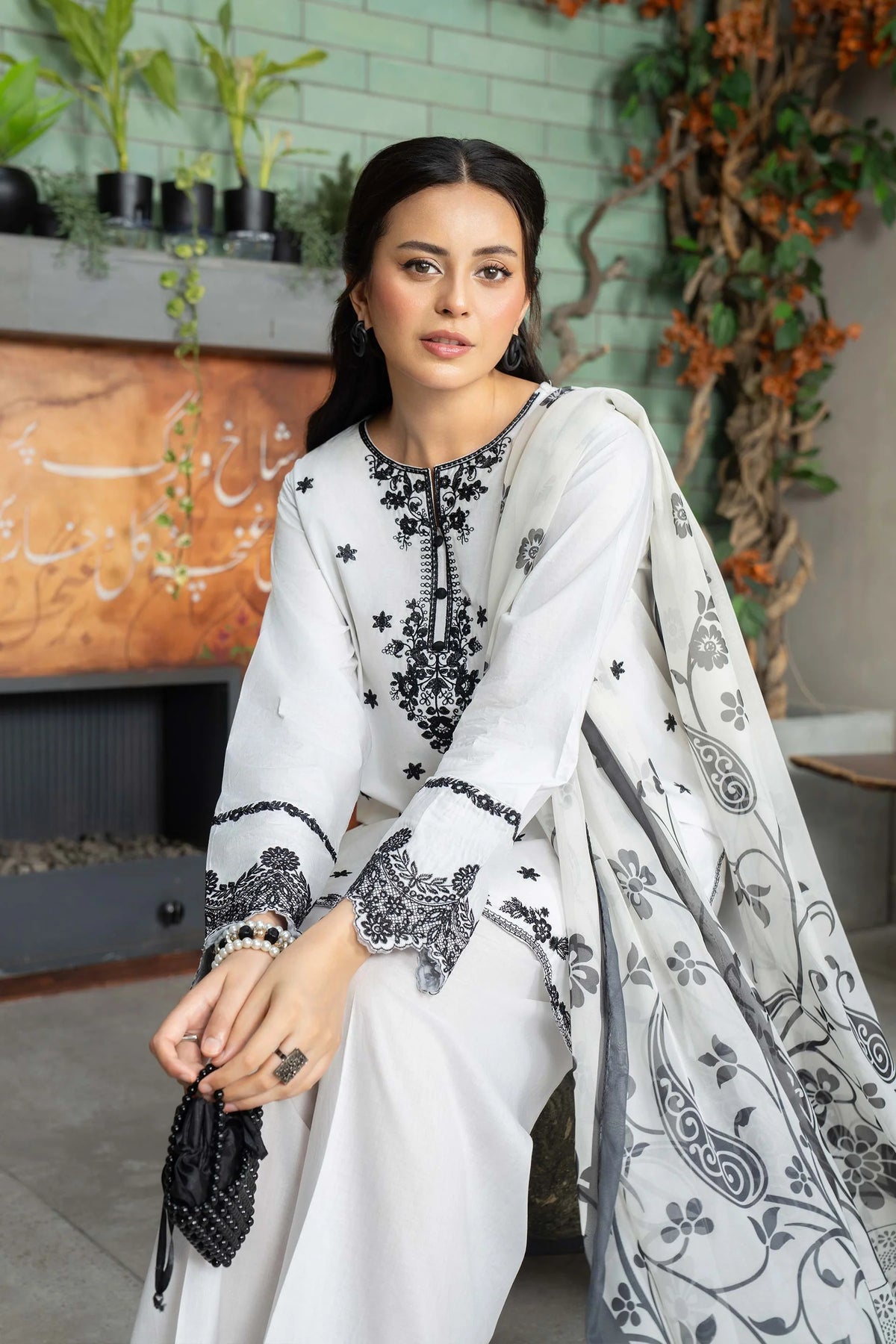 The Faye Lawn Embroidered 3 Piece Stitched set in off white features a breathable cotton lawn shirt with intricate embroidery, offering a refined and elegant look. It pairs seamlessly with a matching cotton lawn bell bottom for a comfortable yet stylish silhouette. The silk printed dupatta adds a delicate, luxurious finish, making this ensemble perfect for both casual and formal occasions.