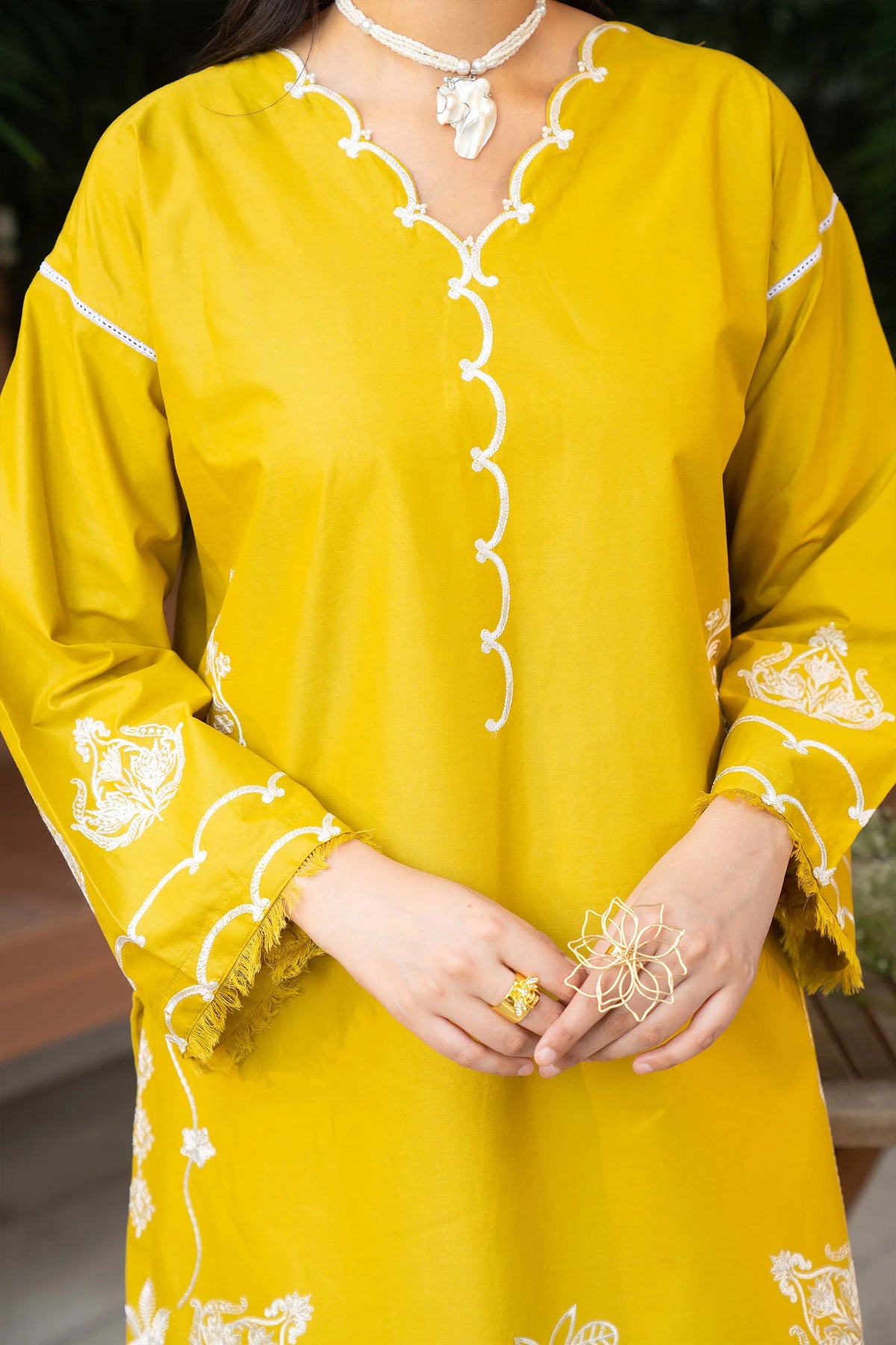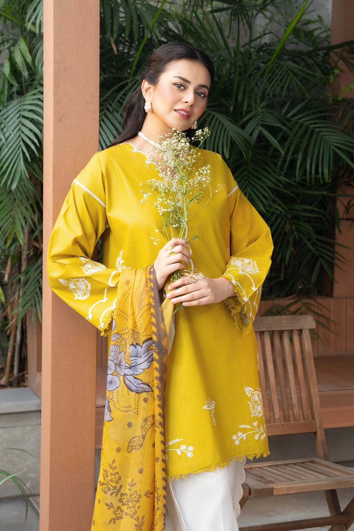 The Orah Lawn Embroidered 3 Piece Stitched set in vibrant mustard features a cotton lawn shirt adorned with detailed embroidery, combining comfort with elegance. It includes matching cotton lawn trousers for a modern, tailored fit. The silk printed dupatta adds a refined touch, completing this versatile ensemble ideal for both casual and formal settings.