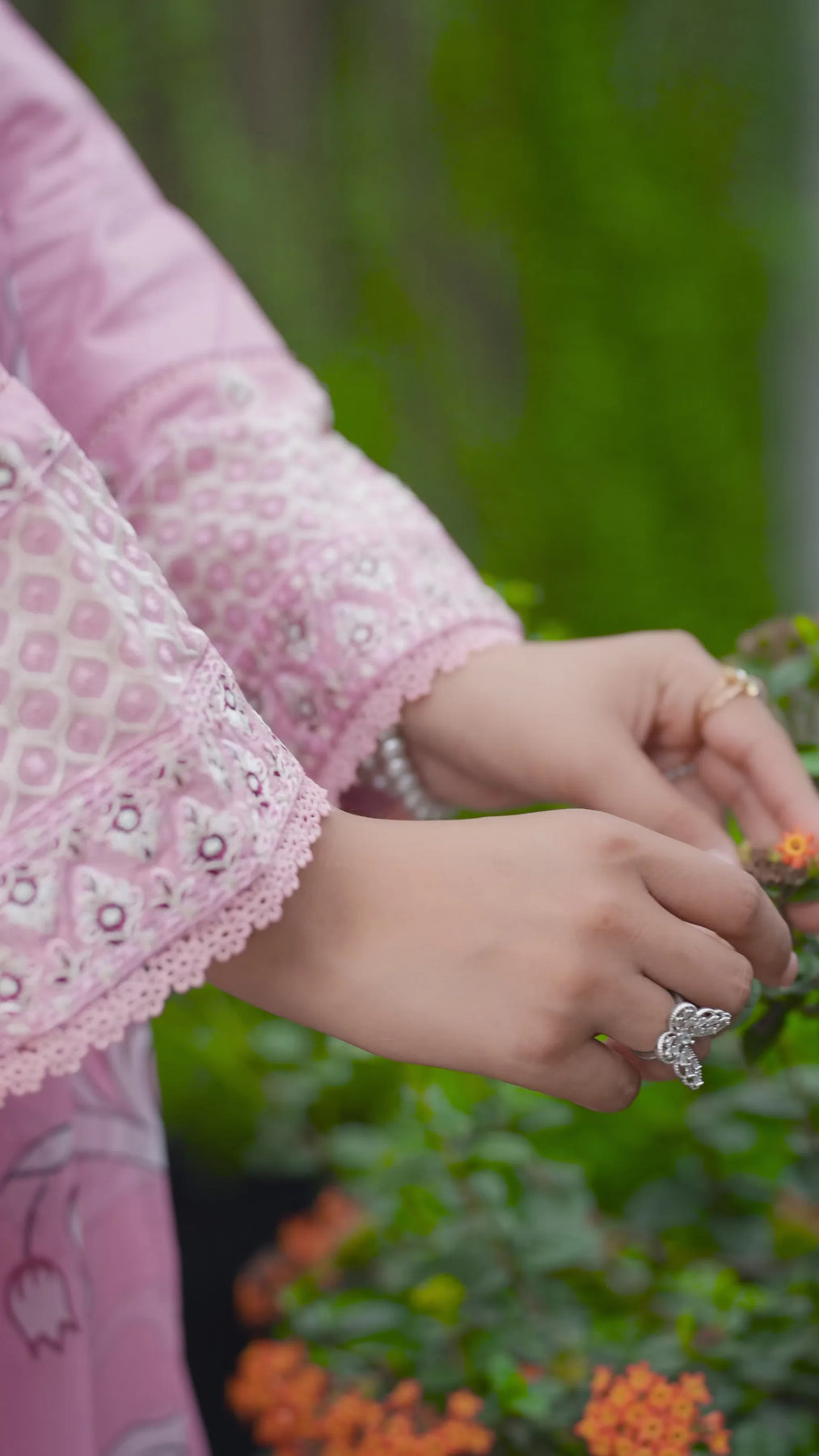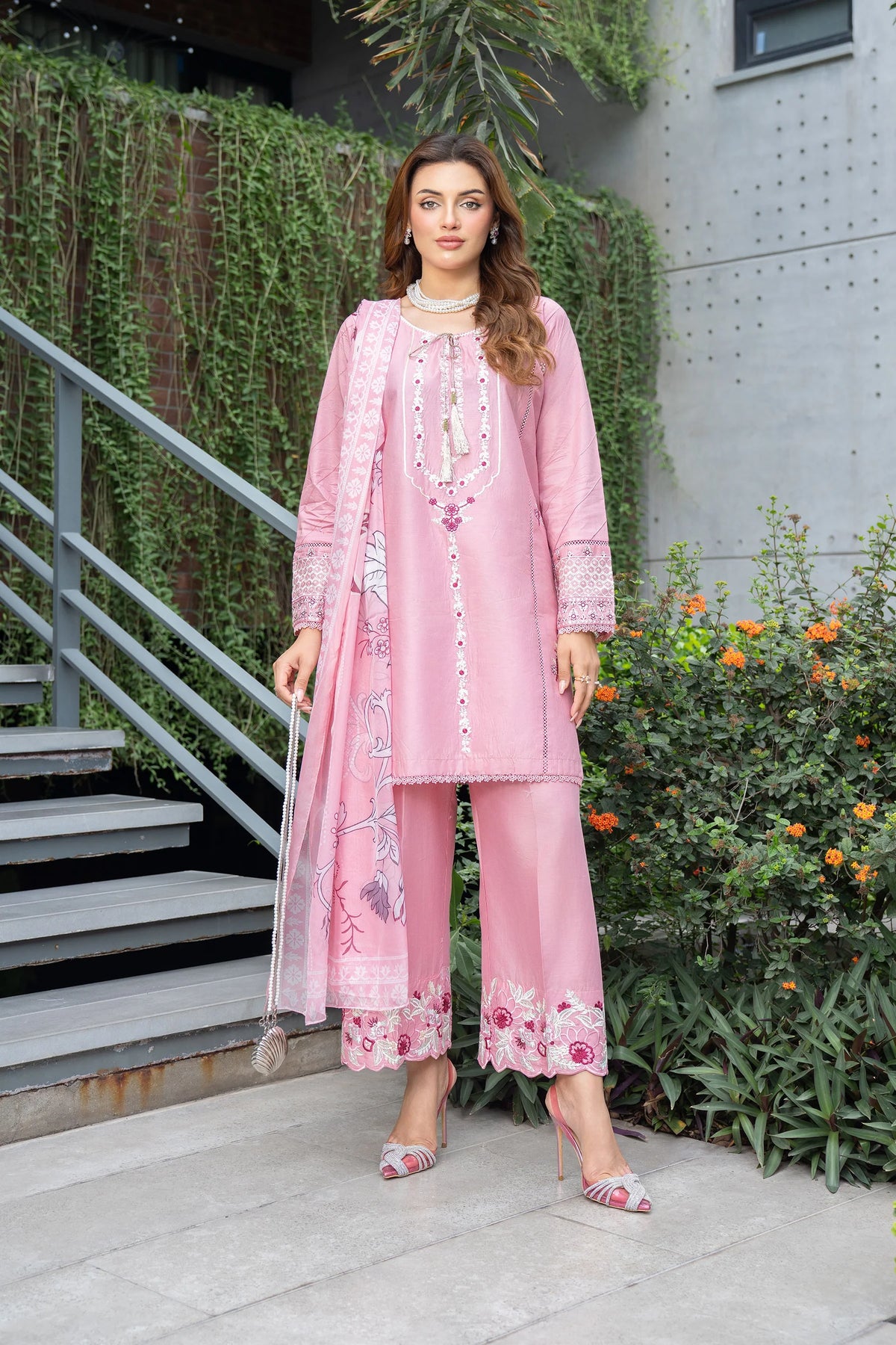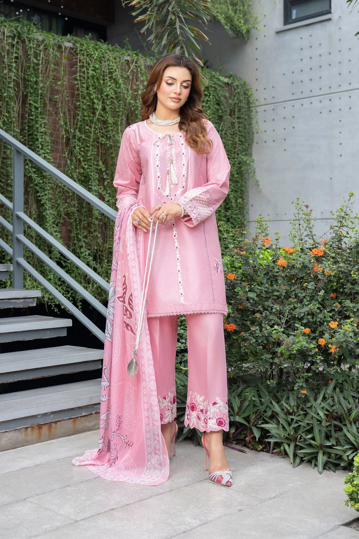 The Rosewood Lawn Embroidered 3 Piece Stitched set in soft pink features a breathable cotton lawn shirt adorned with delicate embroidery, offering a graceful and refined look. It pairs with matching embroidered cotton lawn bell bottoms that enhance the silhouette with elegant detailing. The silk printed dupatta adds a luxurious touch, completing this sophisticated ensemble ideal for both casual and formal occasions.