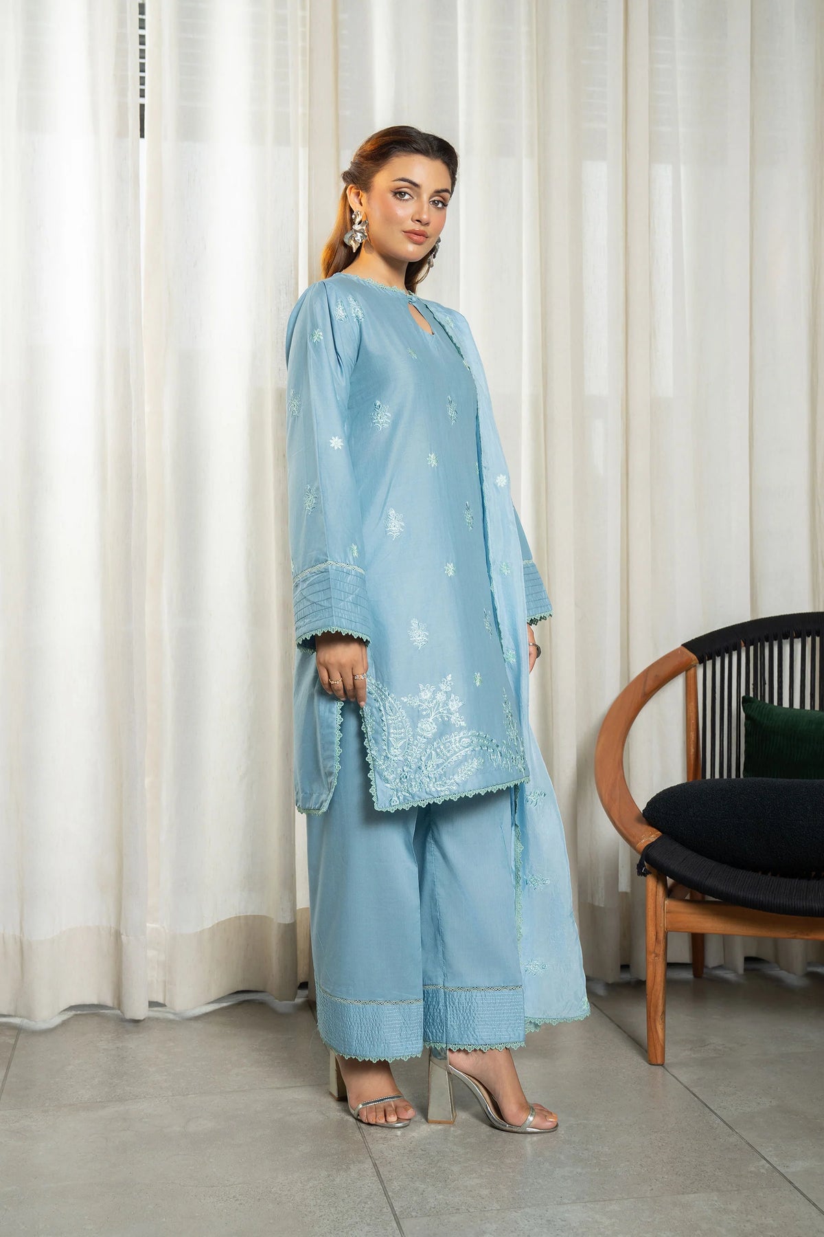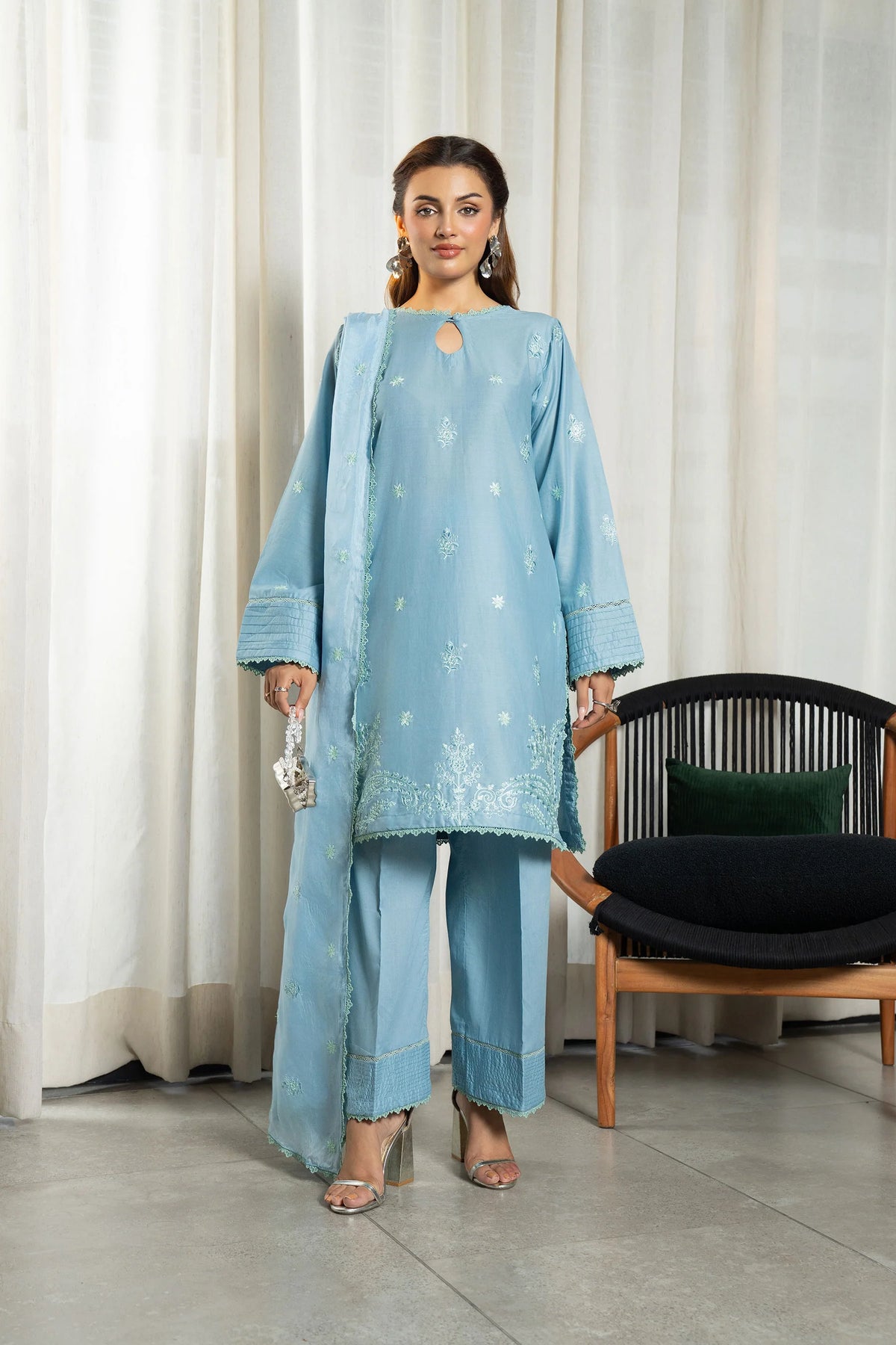 The Skye Lawn Embroidered 3 Piece Stitched set in serene sky blue features a breathable cotton lawn shirt adorned with detailed embroidery, blending elegance with comfort. It pairs with matching cotton lawn stylish trousers for a contemporary, tailored fit. The silk embroidered dupatta adds a luxurious and refined finish, making this ensemble perfect for sophisticated occasions.