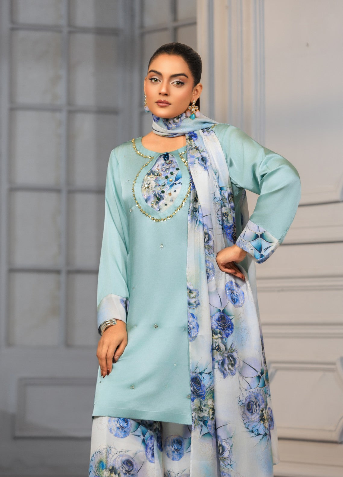The Sahar 3-piece sublimation silk ensemble showcases a radiant paisley-themed shirt and coordinated silk trousers, offering a sophisticated blend of modern artistry and luxurious comfort for the 2026 season.