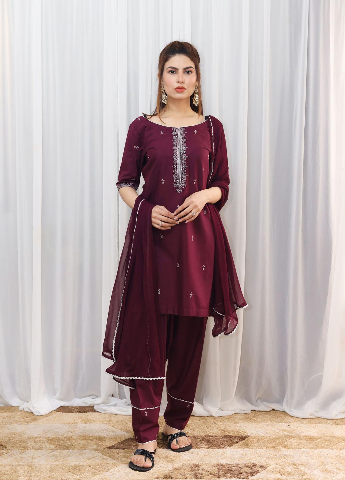 Hina Hassan Studio Casual Pret Cotton 3 Piece Dress Plum Perfection W03P0223