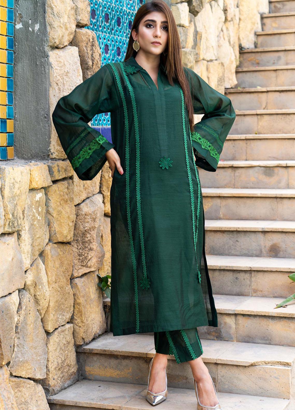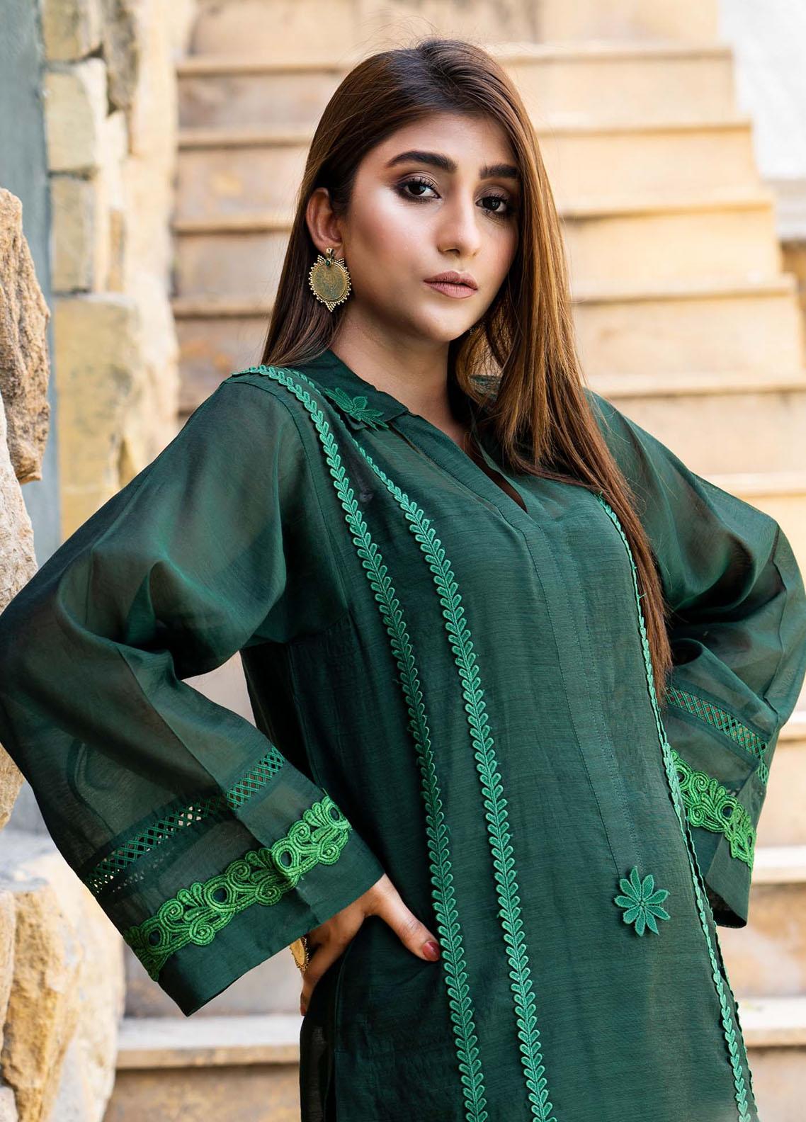 Green cotton shirt with lace detailing of all over body neckline and sleeves. Come along with straight trouser