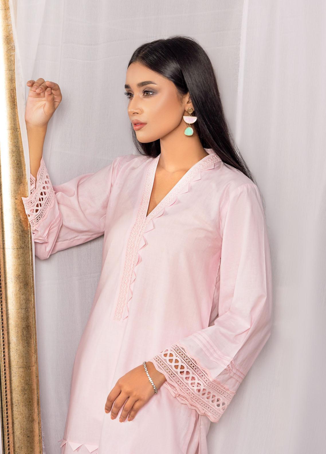 100 percent cotton straight line shirt with placement of same color laces to give an elegant look for daily wear. Paired with trousers.