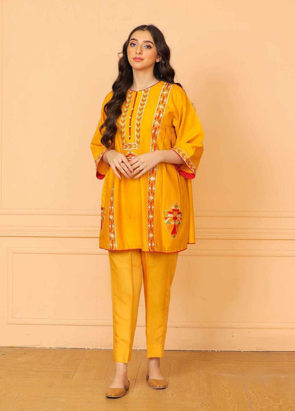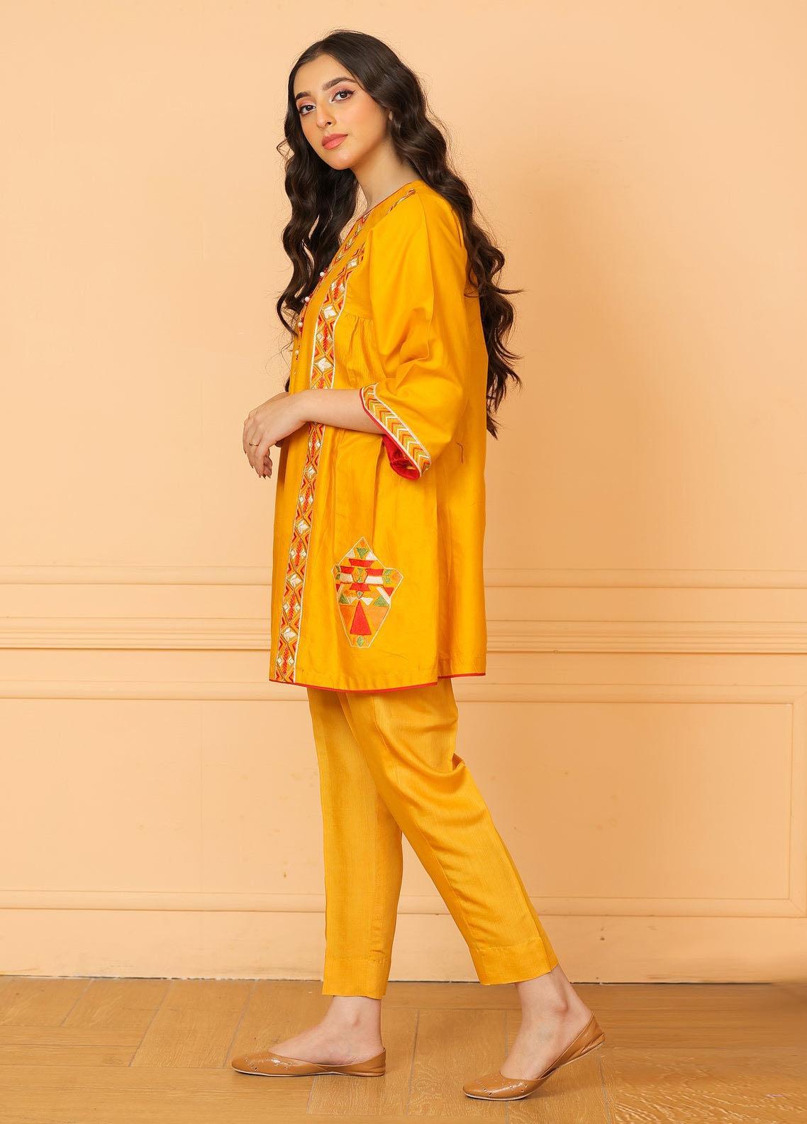 A bright yellow kurta that is adorned with pink white, light green and orange embroidery patches on the both sides of hem.