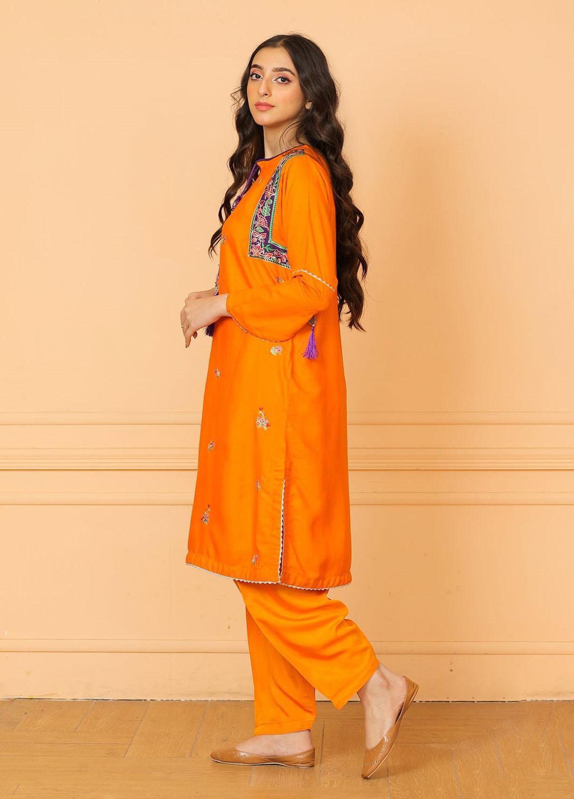 Orange kurta that is adorned with floral embroidery all over.