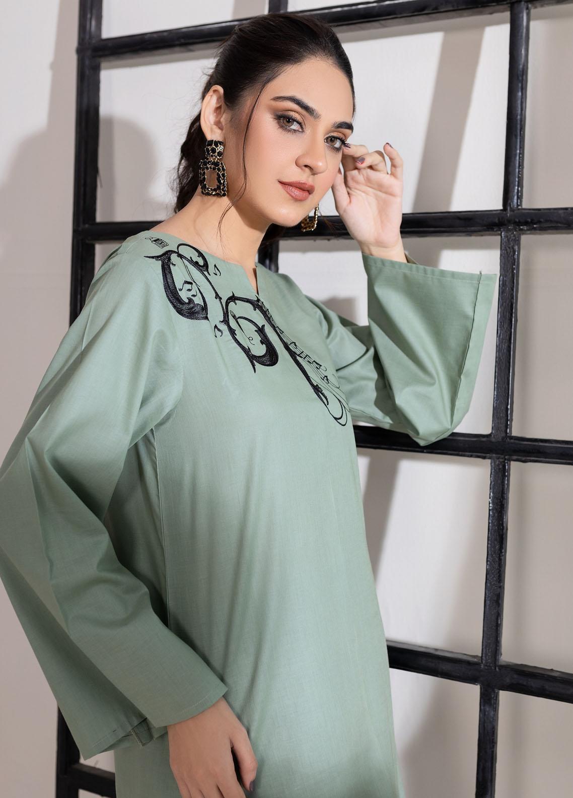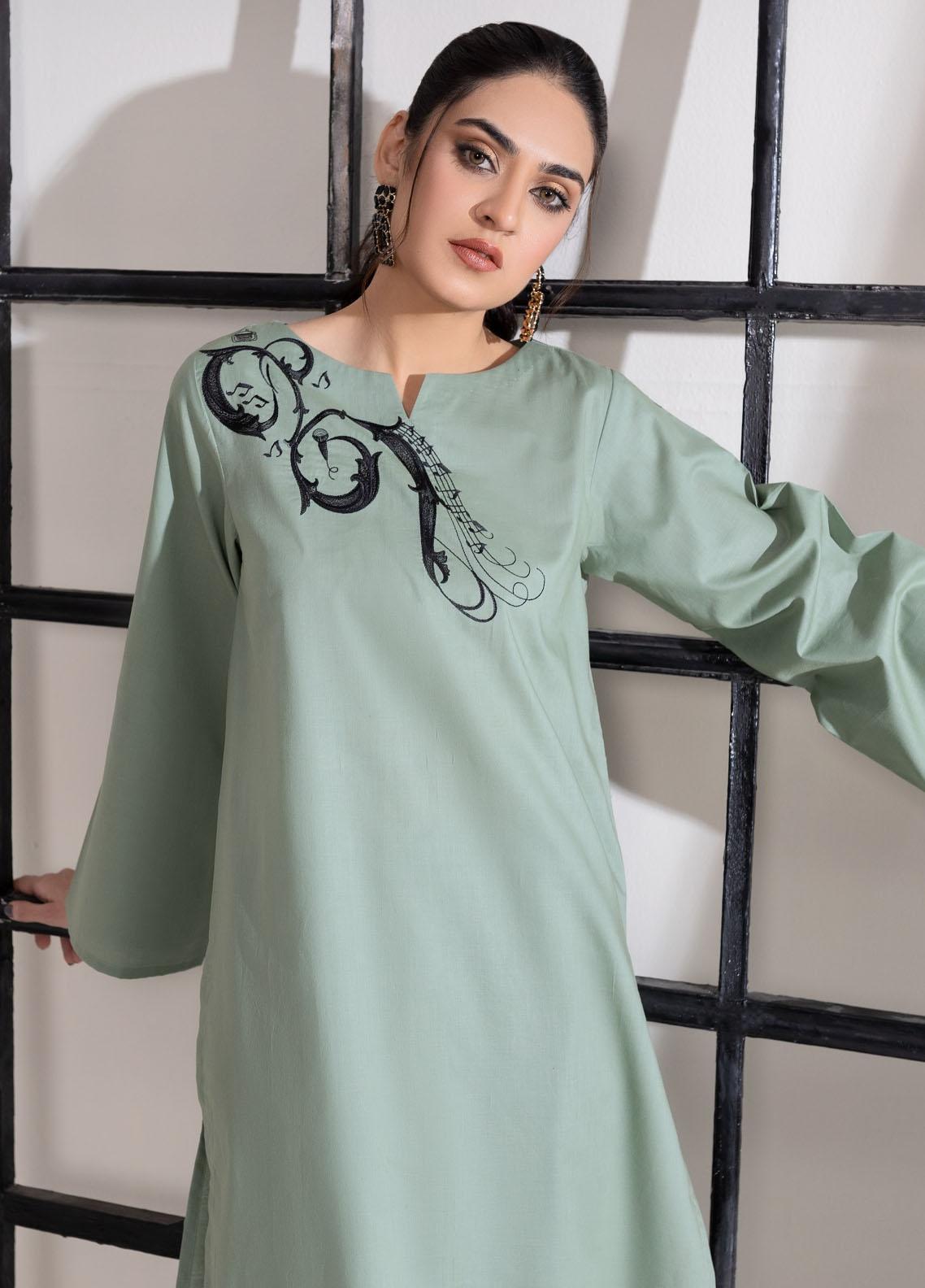 • A contemporary yet classy design with embroidery on the corner of the neckline paired with straight cut trousers.