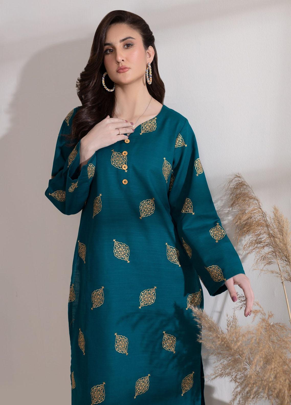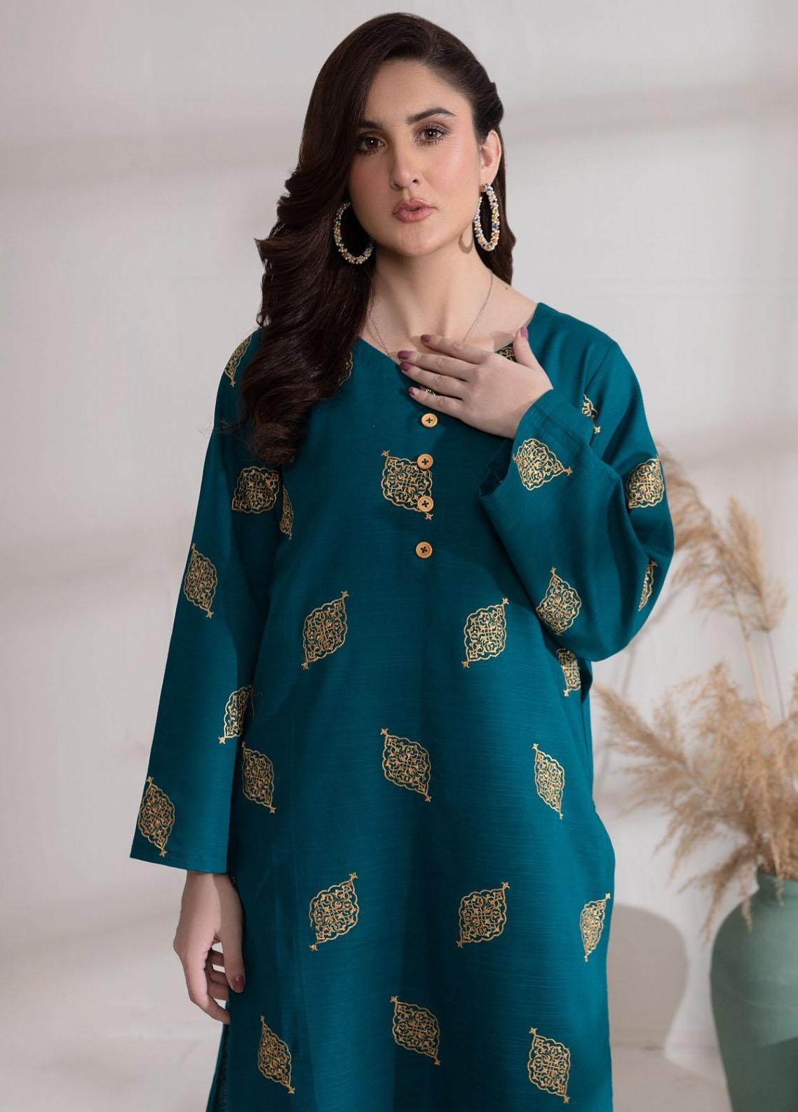 • The solid style statement with a straight shirt embroidered all over and sleeves with buttons on the neckline. Paired with loose trousers.