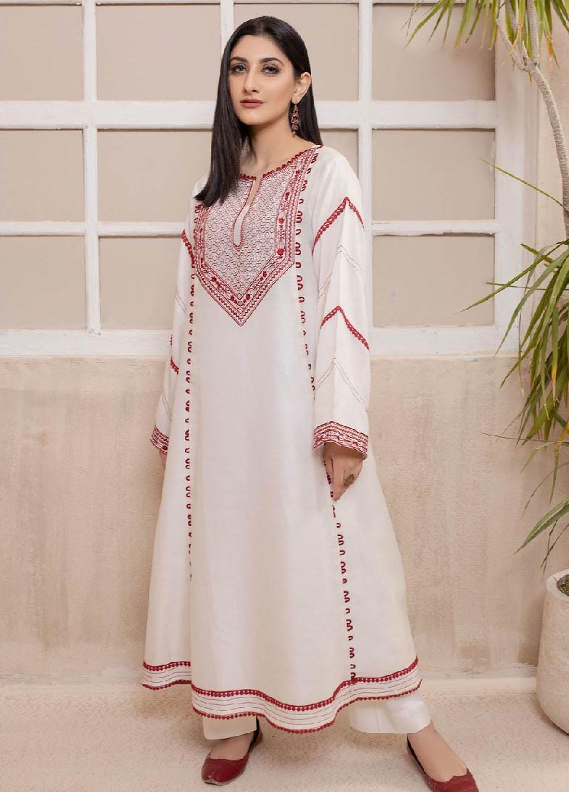 Daisy is our overall white collared A line shirt with embroidered neckline with lace and running stitch on sleeves. Detail on panels is given with maroon loops paired with fitted trousers.Shirt Bumper Net.Trouser Cotton