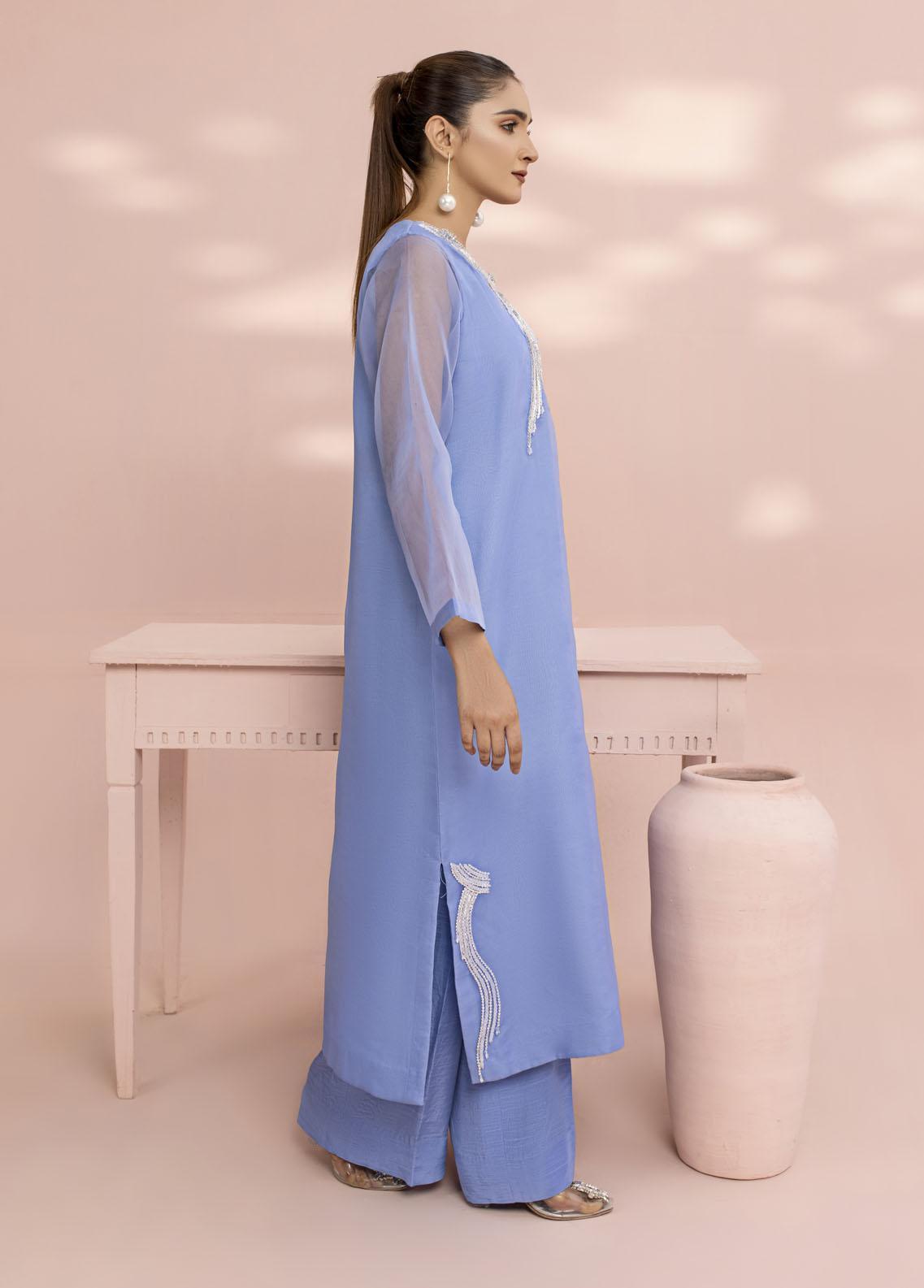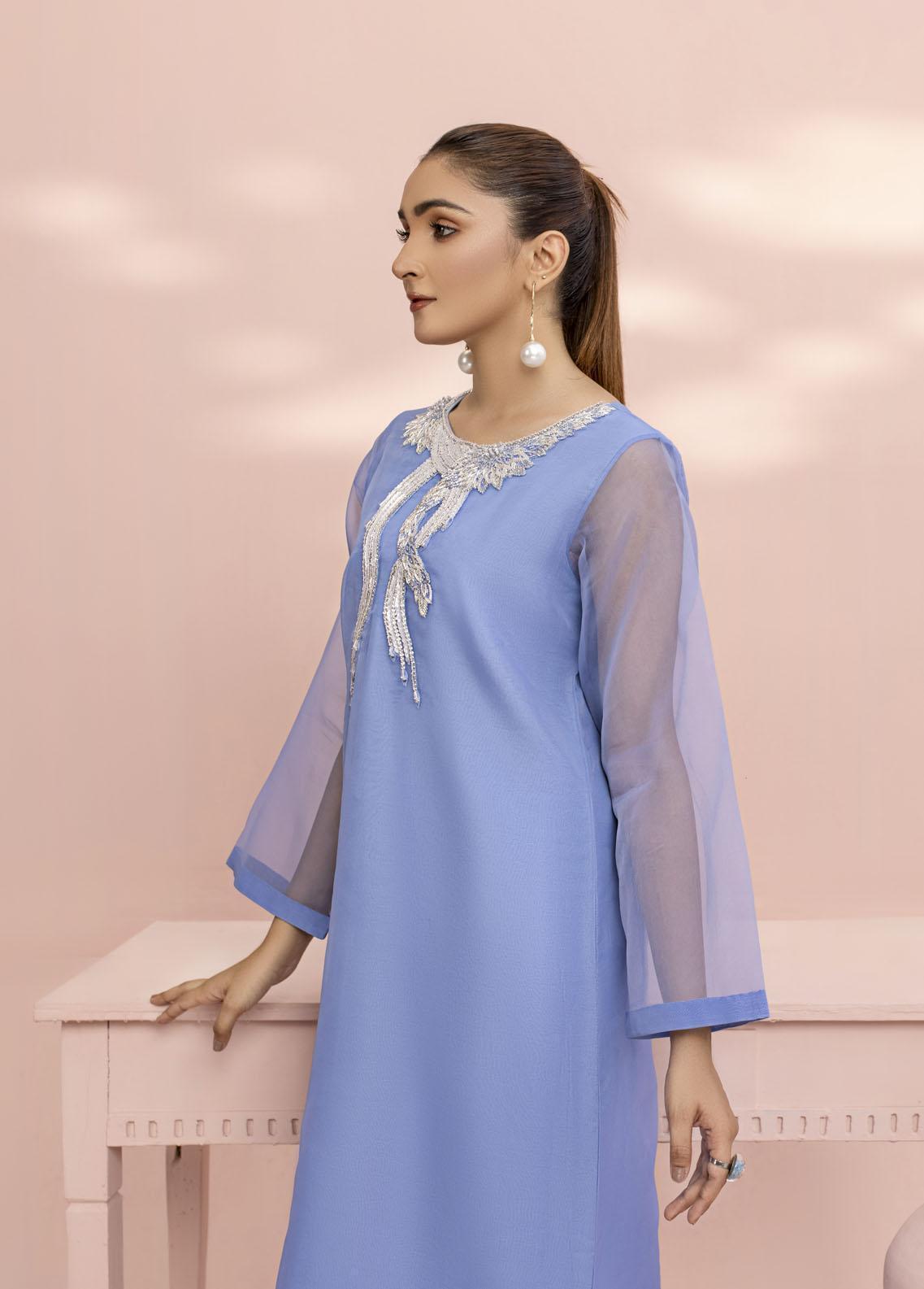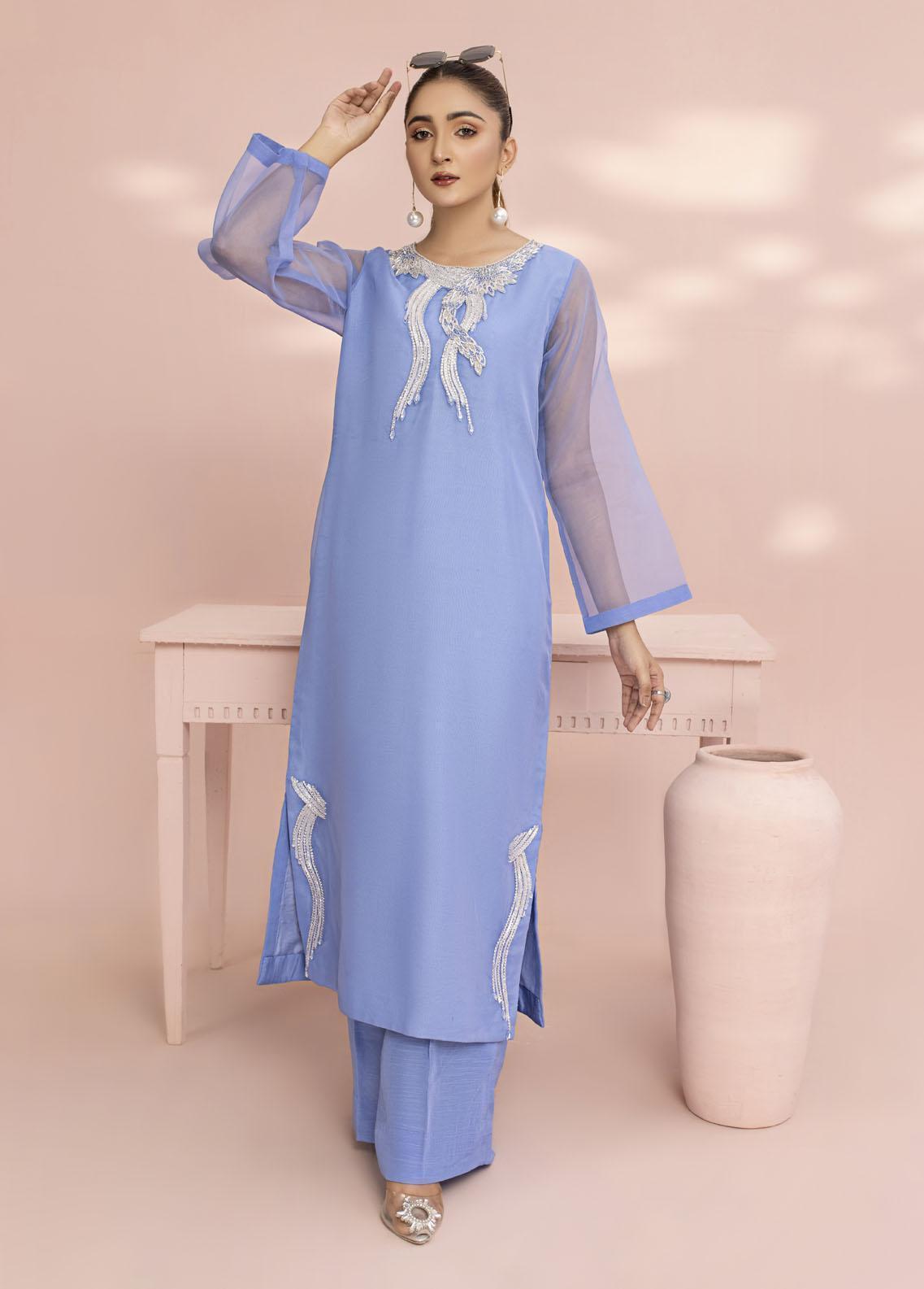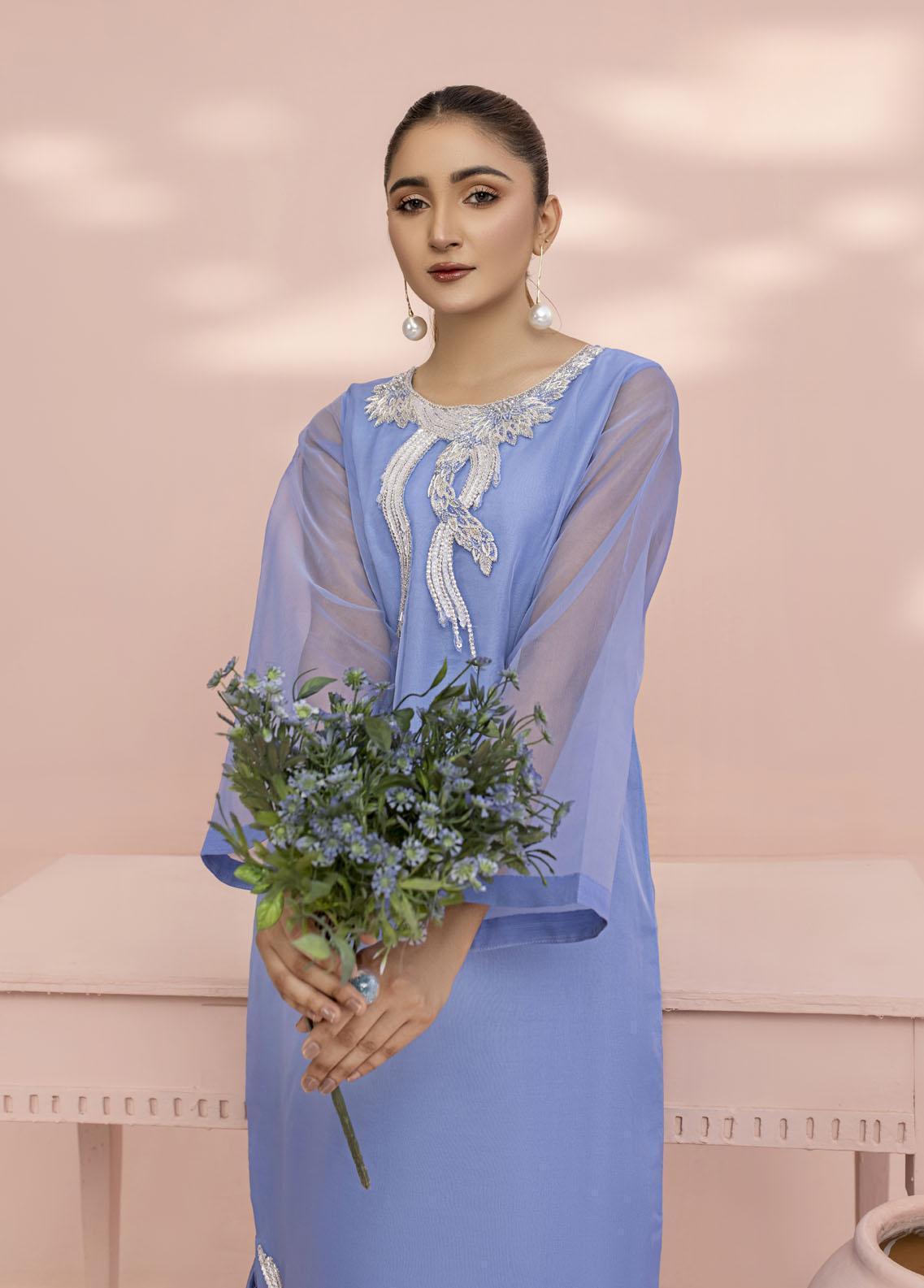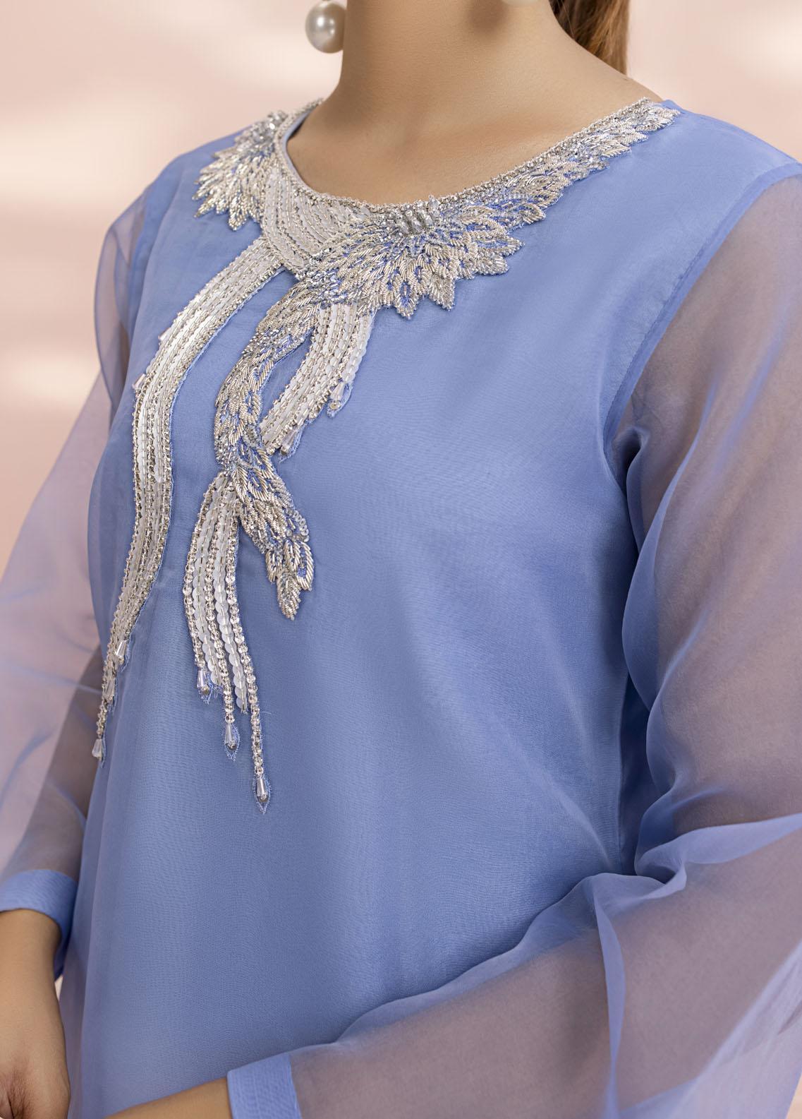 Indulge in sheer elegance with our Gorgeous Ice Blue Organza Shirt paired with Korean Silk Trouser. The intricate silver embellishments on the neckline and borders add a touch of opulence. Elevate your style with this captivating ensemble perfect for making a statement at any sophisticated occasion.