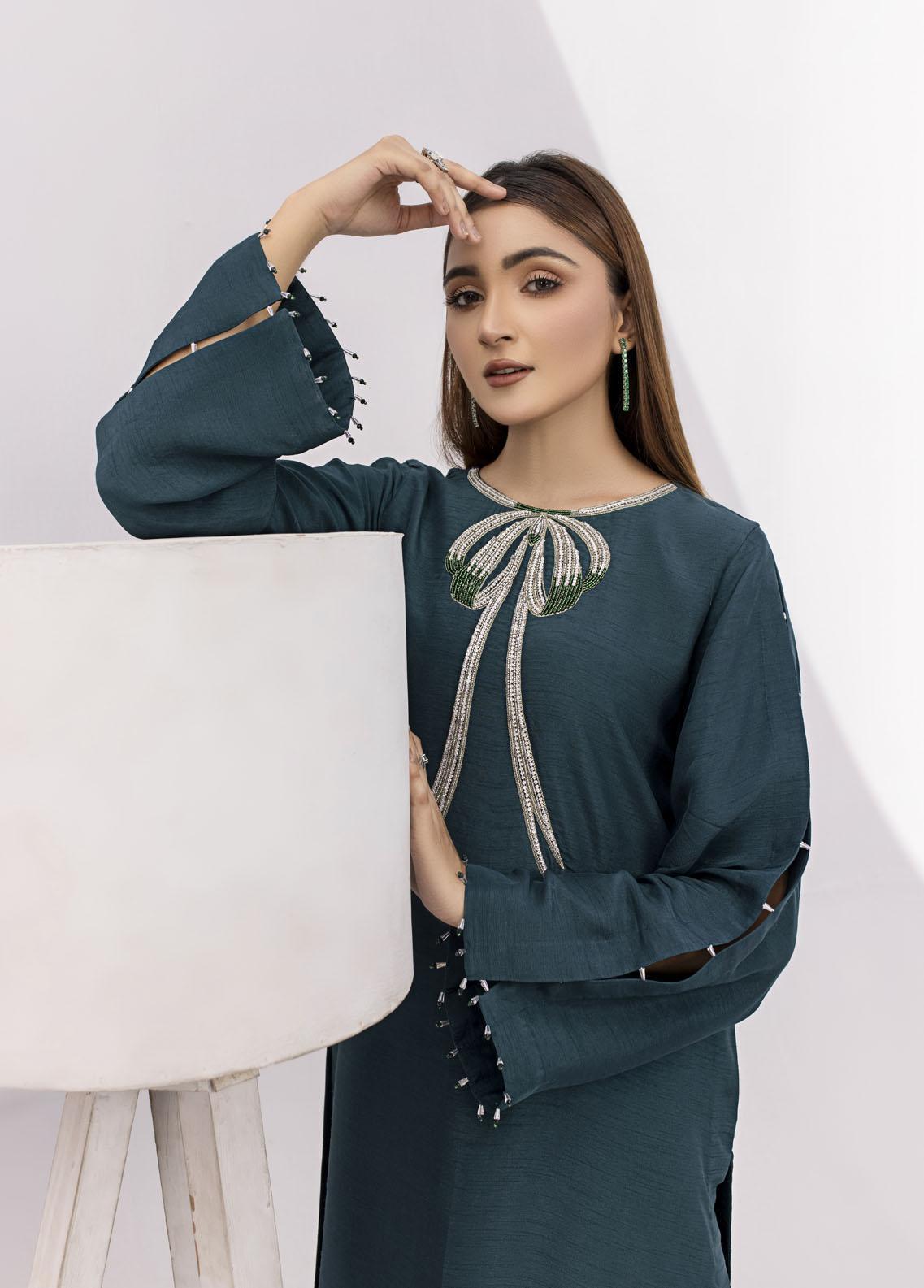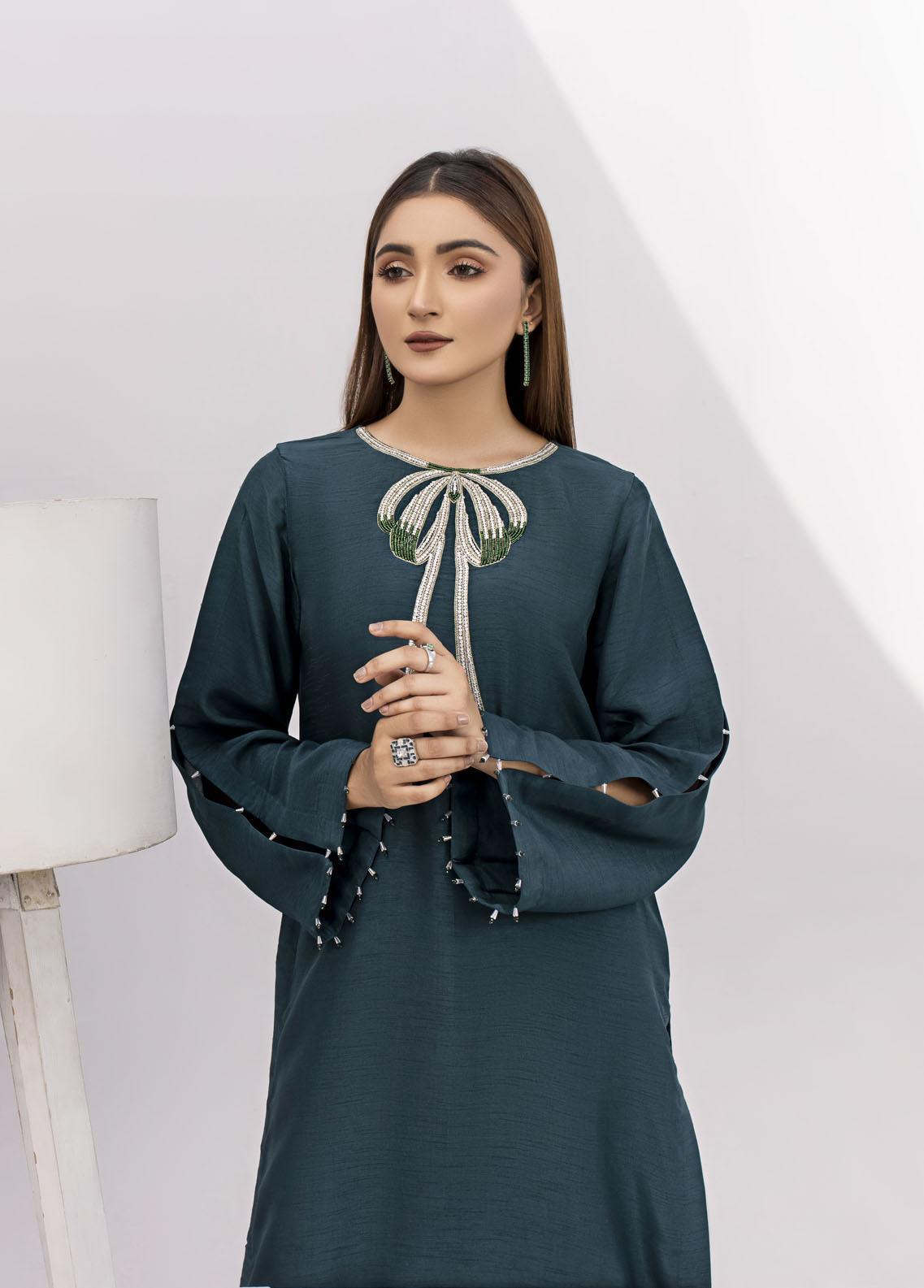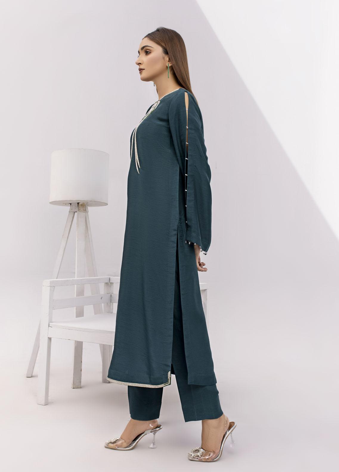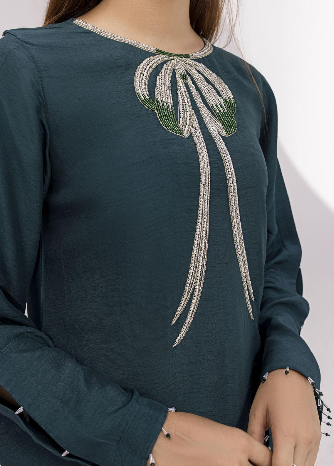 Discover the allure of our Green Korean Silk Suit paired with a plain cigarette trouser for a modern touch. Elaborate silver and green embellishments add a luxurious flair. The neckline detail exudes sophistication making this ensemble a perfect choice for stylish and elegant occasions. Elevate your wardrobe with this captivating piece.