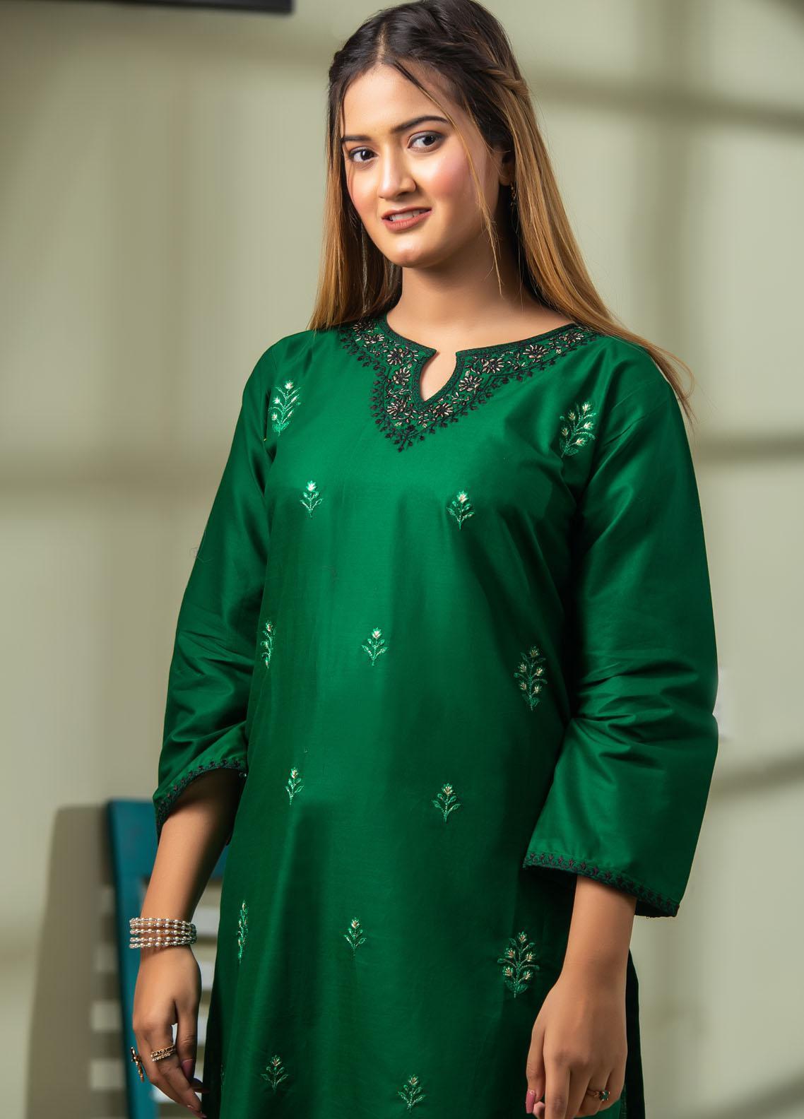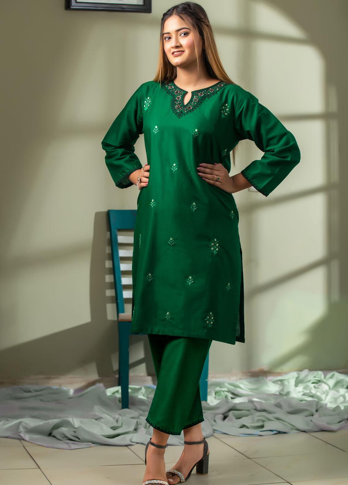 • Summer sale. Envelope yourself in a floral fantasy with this green two-piece ensemble featuring a classical embroidered buds Cotton Lawn shirt. Round Neck with elegant black embroidery comes with Matching embroidered trouser.