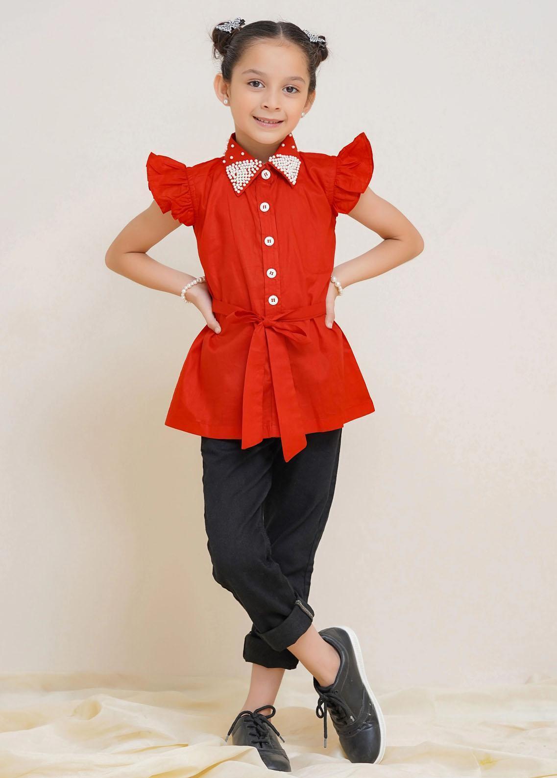 Cotton Comfort Elevate Your Casual Style Top A summery red cotton button down top with pearl accents on the collar a perfect choice for any occasion.