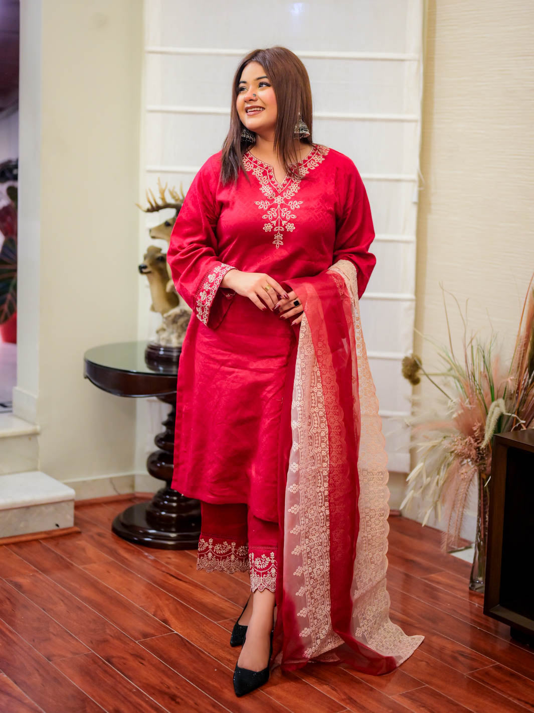 Presenting a stunning piece from our Eid Collection, this elegant woman in a vibrant red dress exudes grace and sophistication. Her poised stance in front of a textured wall enhances the visual appeal, embodying the spirit of celebration and style synonymous with Eid festivities. The rich color and flowing fabric create an eye-catching silhouette, perfect for any festive occasion.
