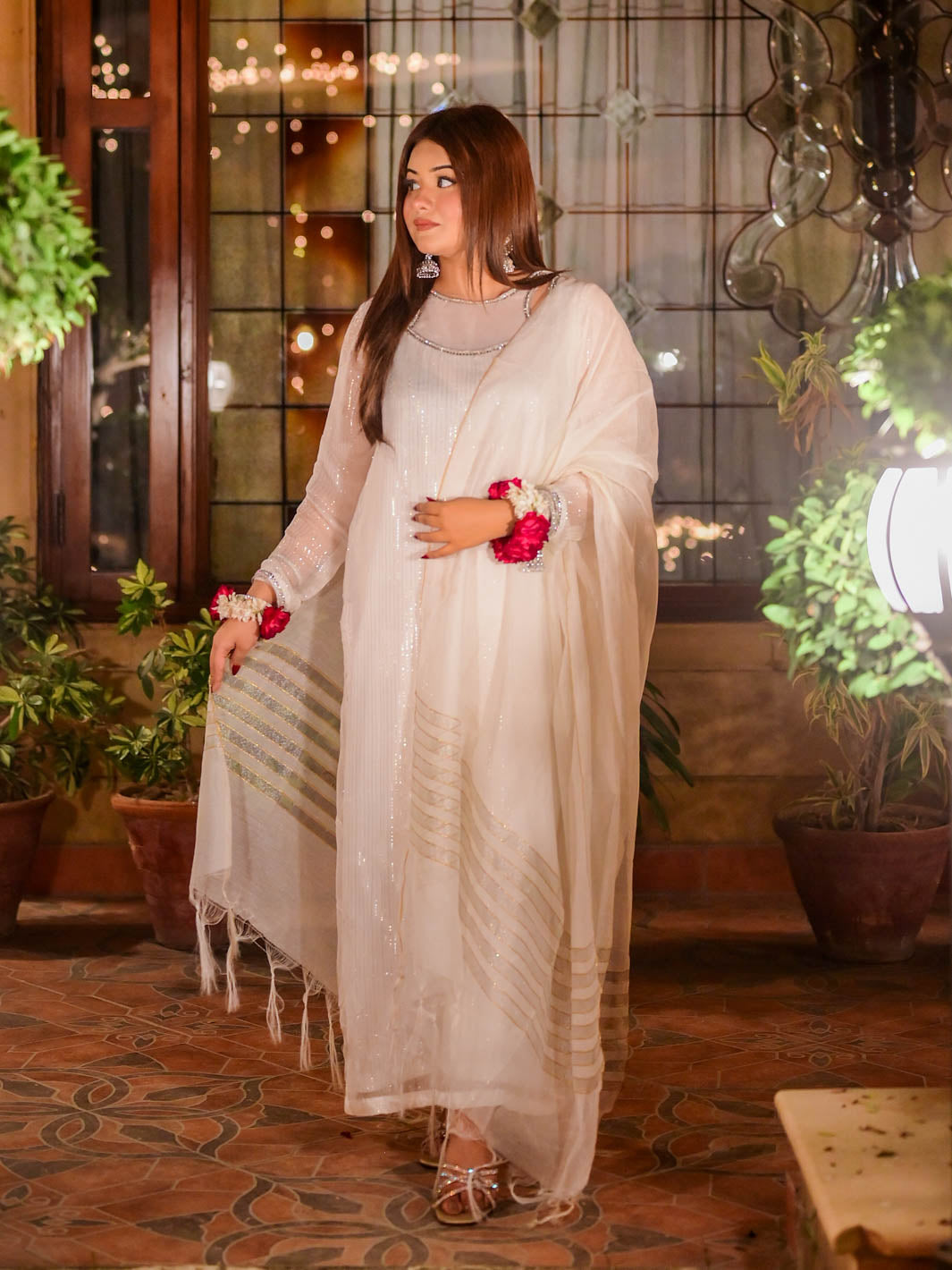 Elevate your festive wardrobe with our Fancy Eid Collection, featuring a stunning ensemble that showcases a woman in a graceful white dress. This elegant outfit is perfect for celebrating Eid in style, combining traditional charm with contemporary flair. The soft fabric and intricate design ensure comfort and sophistication, making it an ideal choice for any festive occasion.