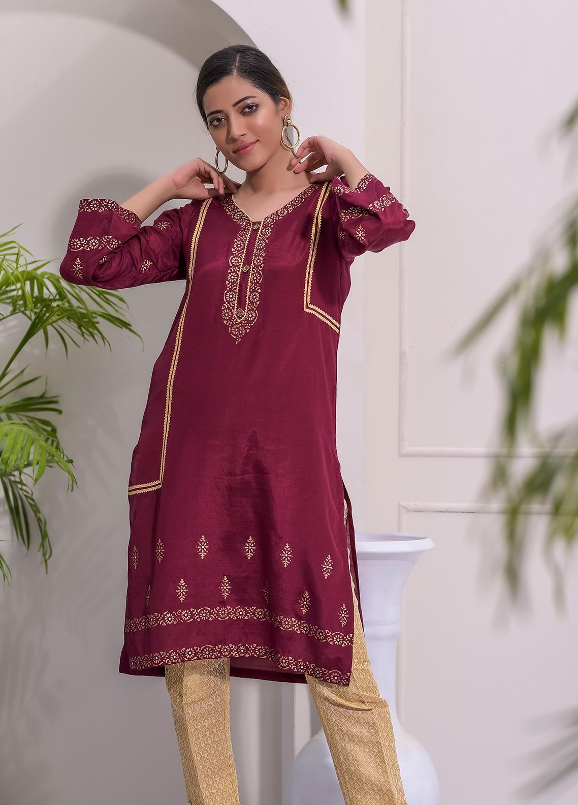The Pure Cotton Silk Straight Silhouette Shirt With Block Printed Details In Deep Blush Shade Featuring Andlace Details