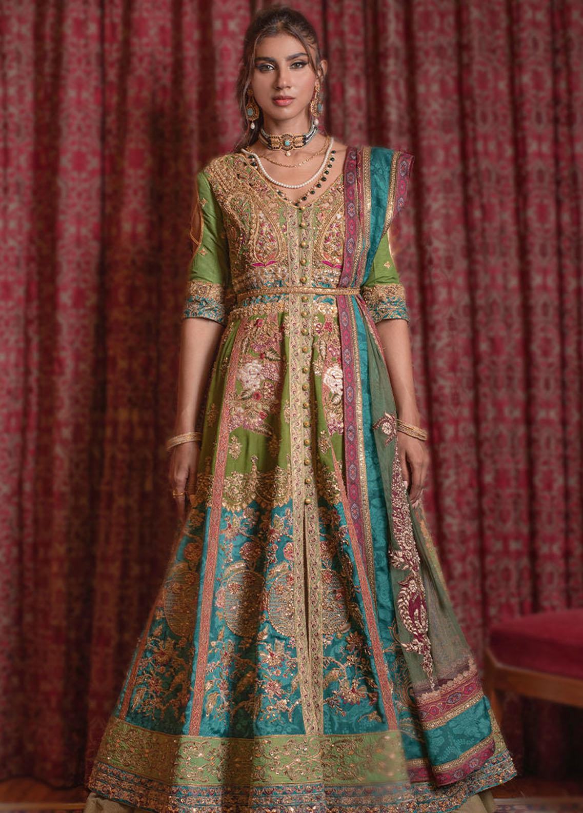 A green and turquoise front open frock outfit paired with a printed net dupatta is indeed a delightful and colorful choice especially for festive occasions and celebrations Front open frock is a stylish and contemporary twist on traditional frock style outfits It features loop buttons allowing for ease of wear and a trendy look The combination of green and Farozi is vibrant and eye catching making it a perfect choice for festive events Green represents nature growth and freshness while Farozi adds a pop of lively turquoise creating a visually appealing contrast Printed textured base on silk fabric The jorah is embroidered in zari and resham thread enhanced with intricate heavy antique gold zardozi work The printed net dupatta complements the outfit beautifully Net fabric has a delicate and sheer quality which adds an element of grace and femininity to the ensemble The printed design on the dupatta feature intricate patterns Beautiful resham thread embroidered motif is appliqued on the duppatta Shirt fabric SILK Dupatta Fabric NET Pant fabric SILK