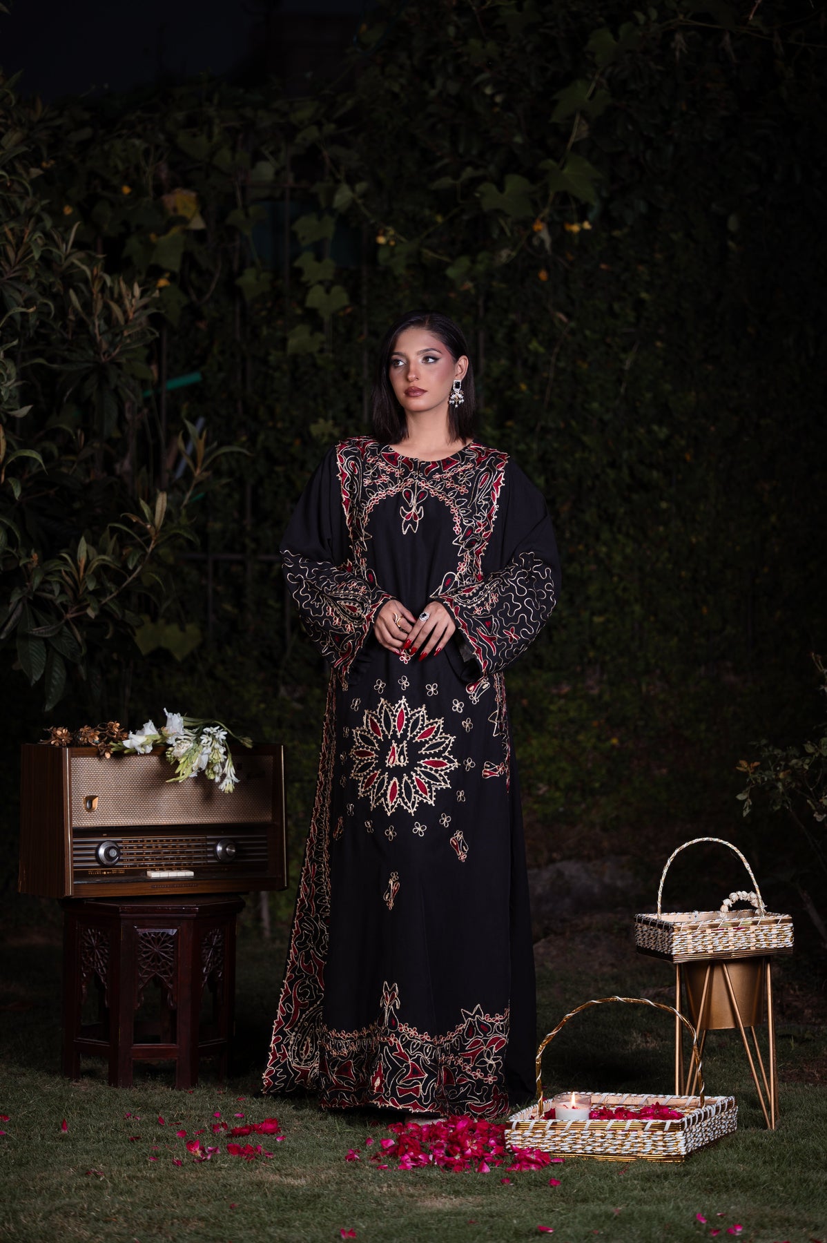 An elegant black cotton silk kaftan adorned with handmade aari embroidery in tones of red, gold, and ivory. The intricate craftsmanship and flowing silhouette make it a perfect fusion of comfort and sophistication. Detailed floral and paisley motifs enhance its timeless charm, making it a standout choice for festive dinners or evening gatherings.