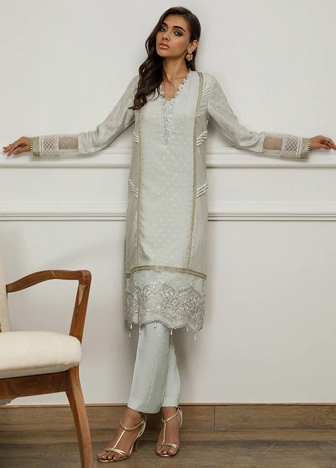 Ready to wear, khadi jacquard fabric in sage green tone is decorated with pleates, embroidered borders, and laces. The shirt front is heavily embellished with thread, zari, sequin, pearl, and stone work.