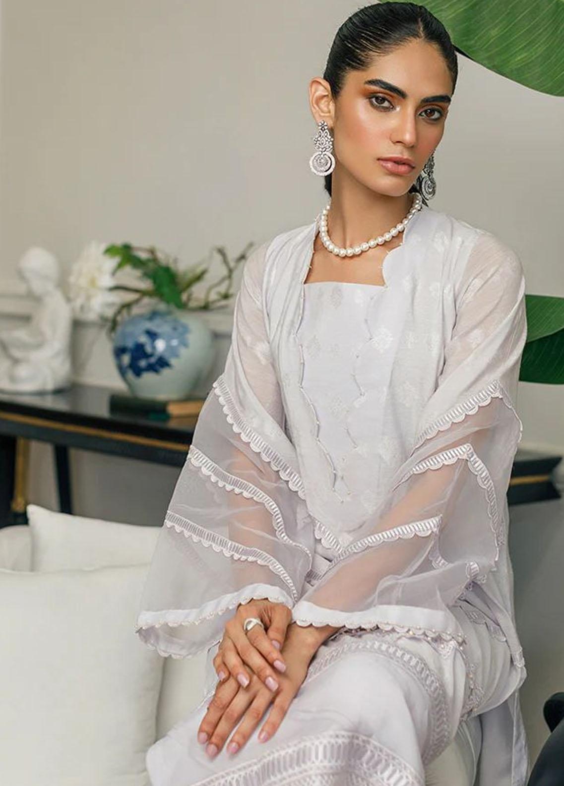 Ready-to-wear pastel purple shade tunic in khaddi net with pearl ornamented neckline. The shirt is adorned with lace and pleat work finished with pearls for an alluring look