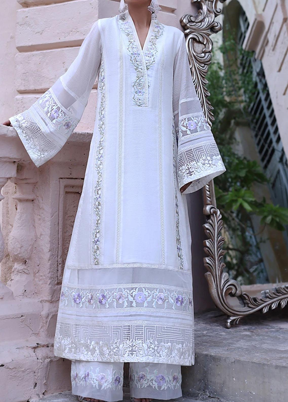 Fully embroidered white long length ready to wear tunic on khaddi net fabric. Compulsory to your wardrobe with chic embroidery on neckline, sleeves and daman.