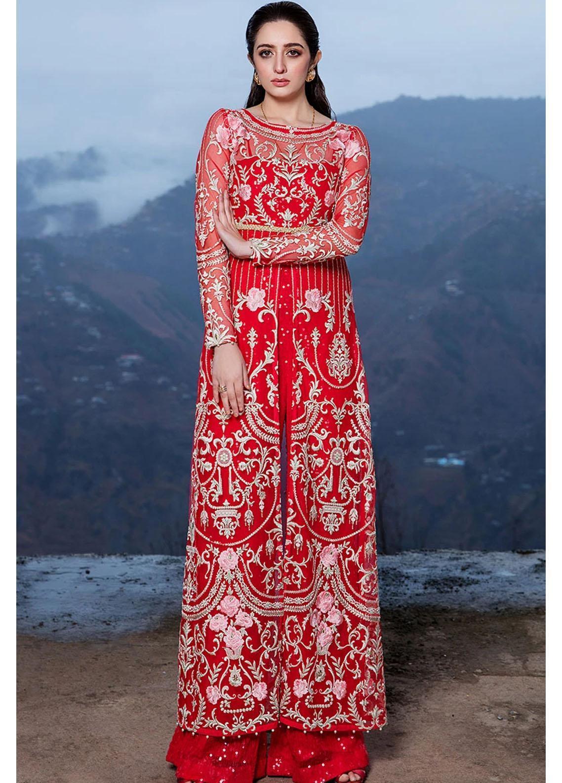 Stitched fully embroidered dress with jumpsuit inside and pearl embellished belt on waist.