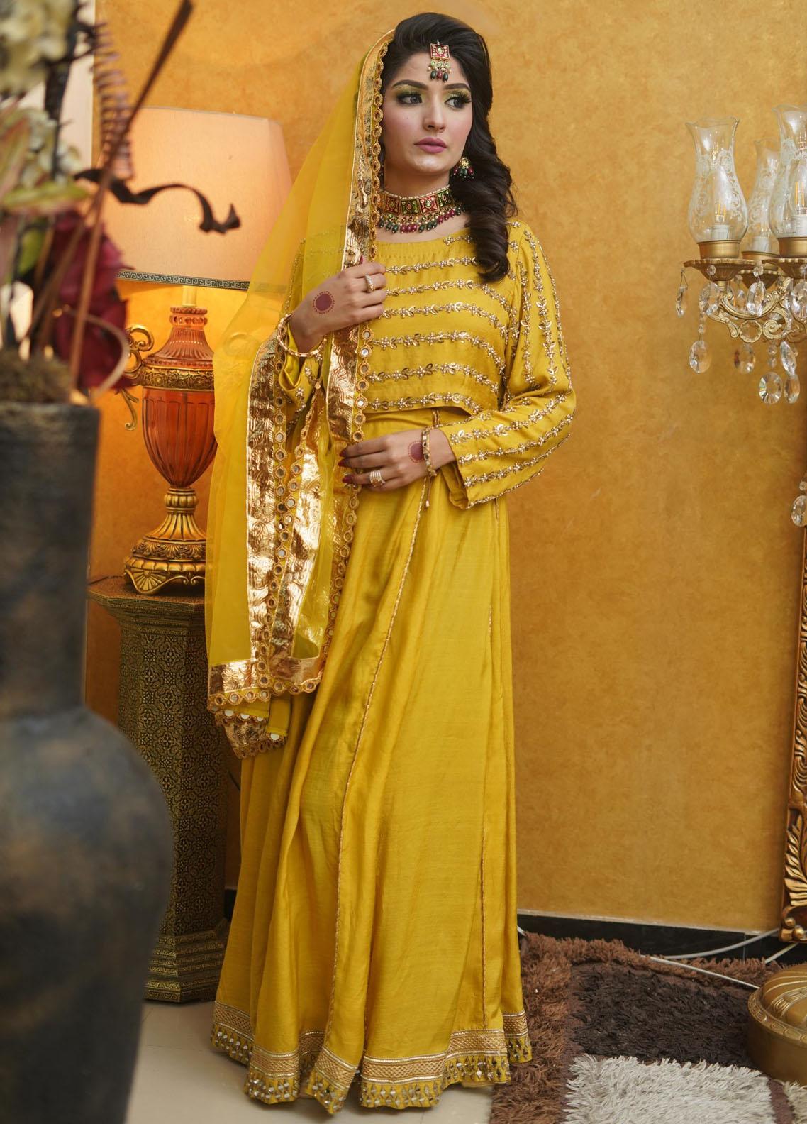 A stand out look for joyous occasions, this ensemble consists of a deep yellow hued lehenga choli.