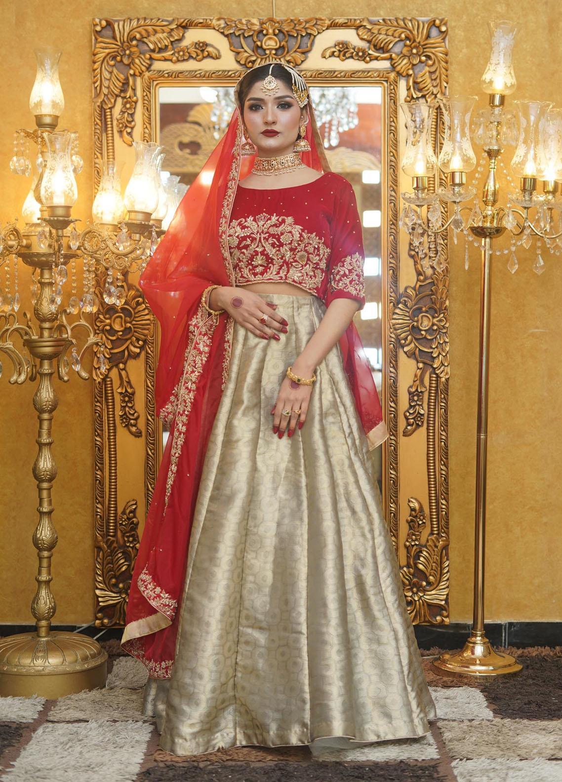 An ethereal and feminine couture look, this ensemble consists of a red/grey lehnga choli with accents of rose in the embroidery and finish.