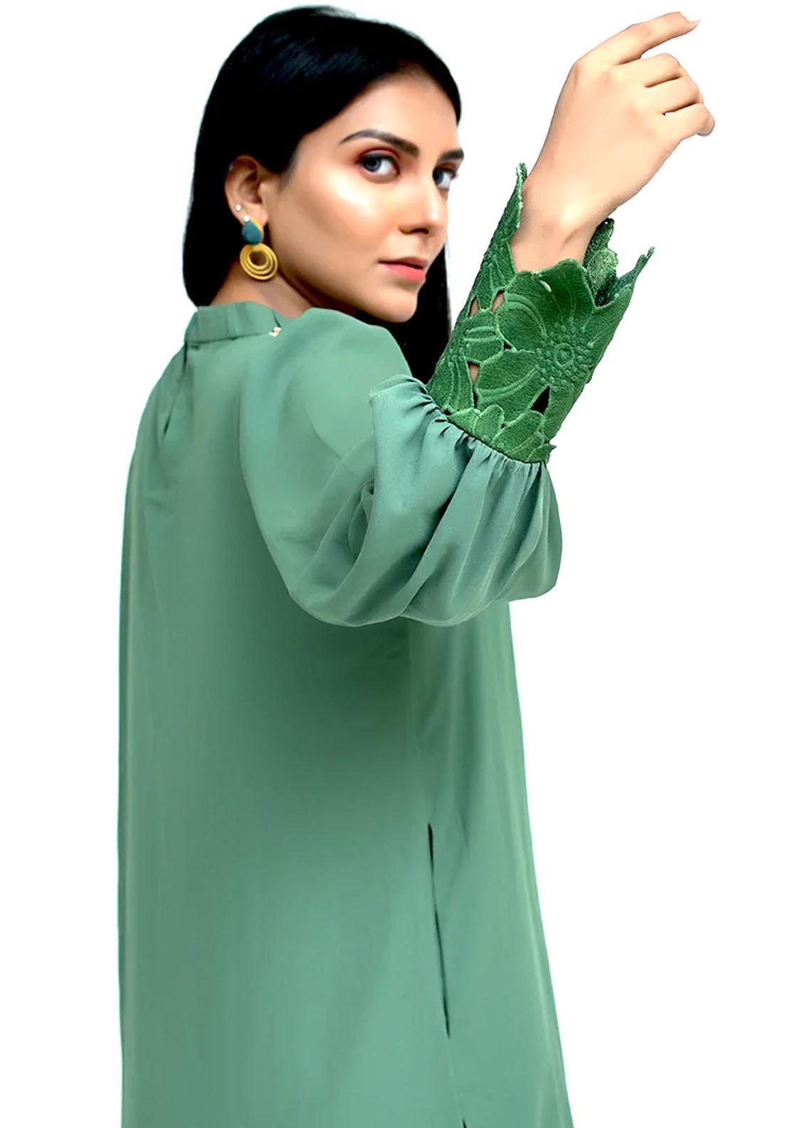 Material Green Georget having appealing jewel piece on neckline along with embroidery on sleeves with 3D Flower