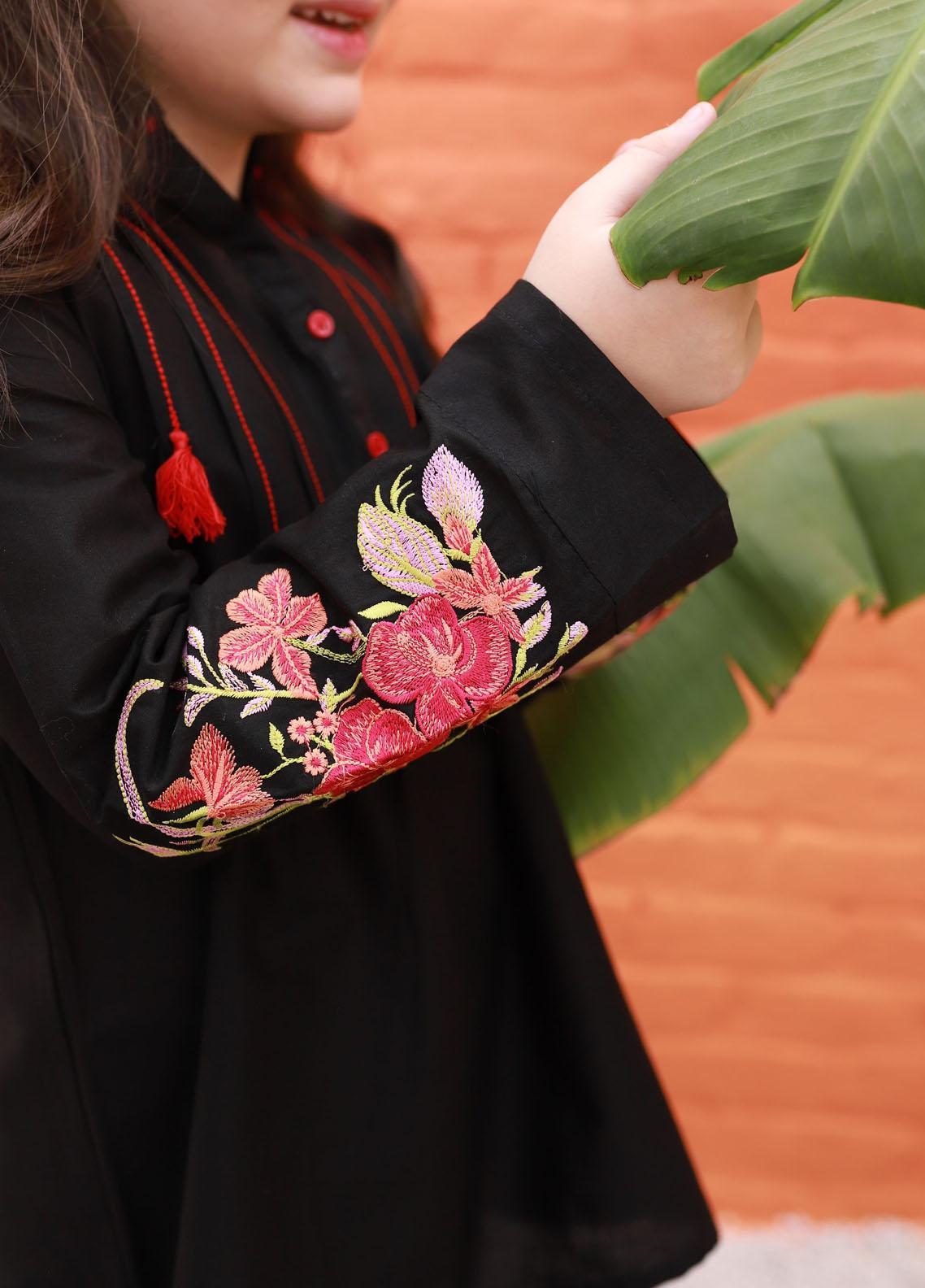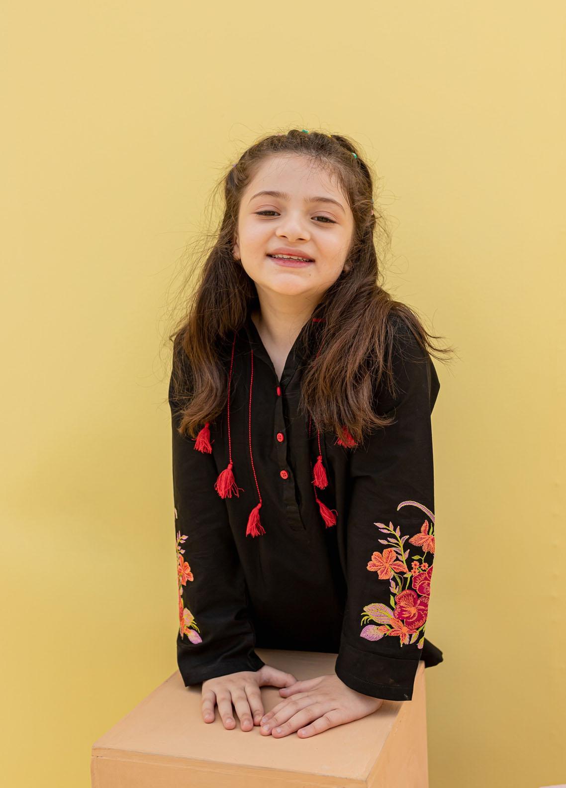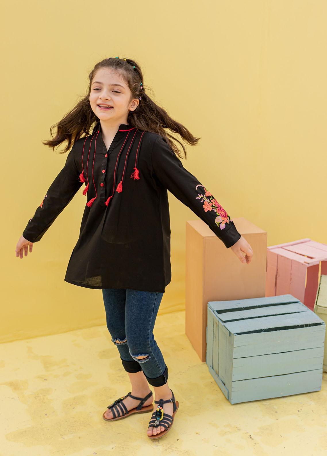 Premium cotton short length top with dense embroidery on sleeves and pleates on front embellished with thread tussles. A perfect top for summers.