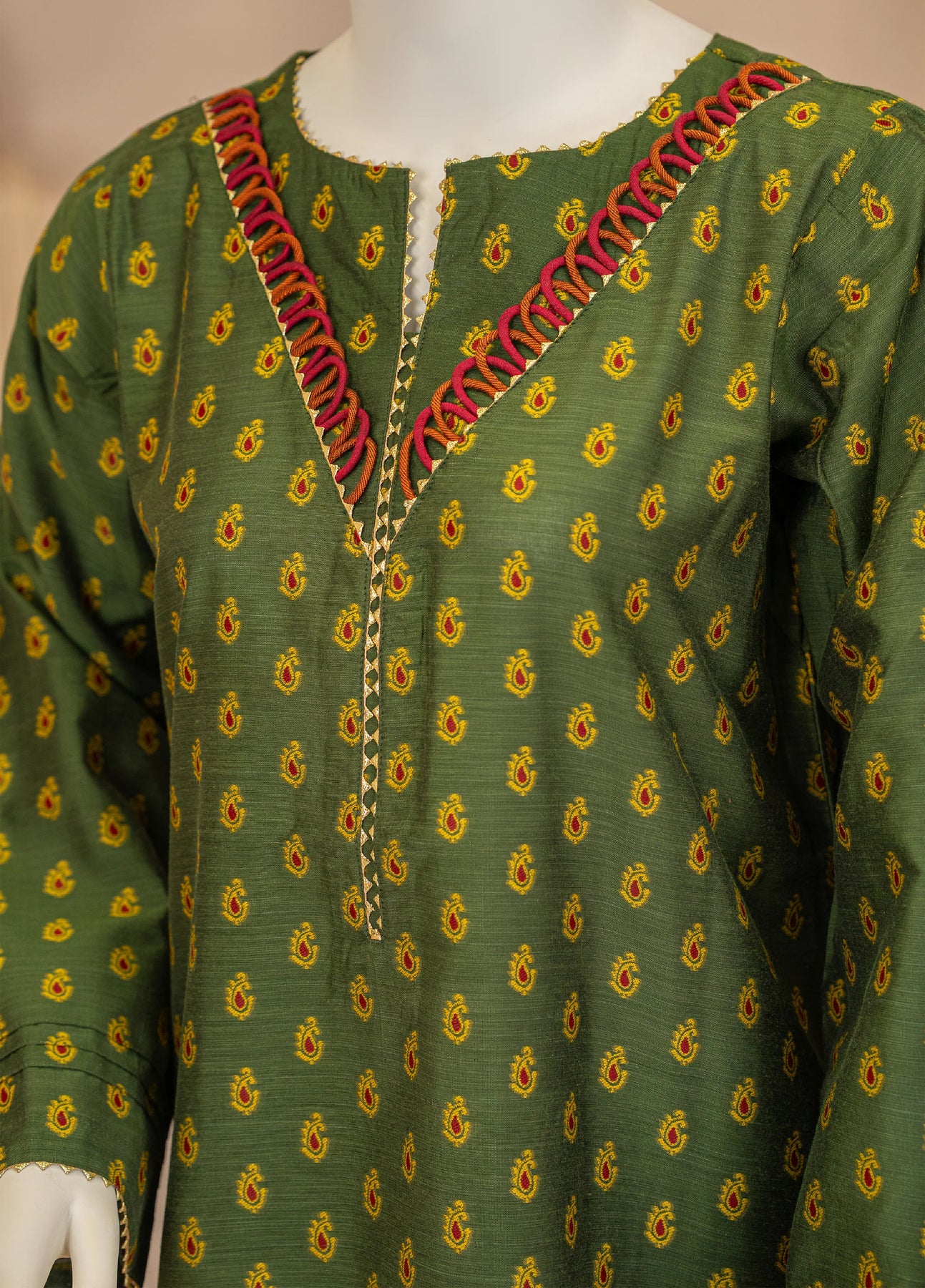 A refined green two-piece set featuring a relaxed-fit kurta with an intricately detailed neckline of loops. Paired with a straight-fit trouser, this ensemble perfectly balances effortless comfort with understated elegance.