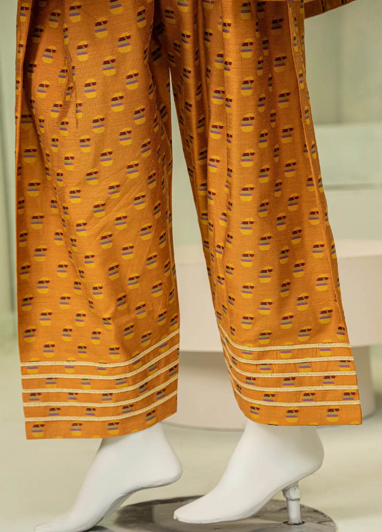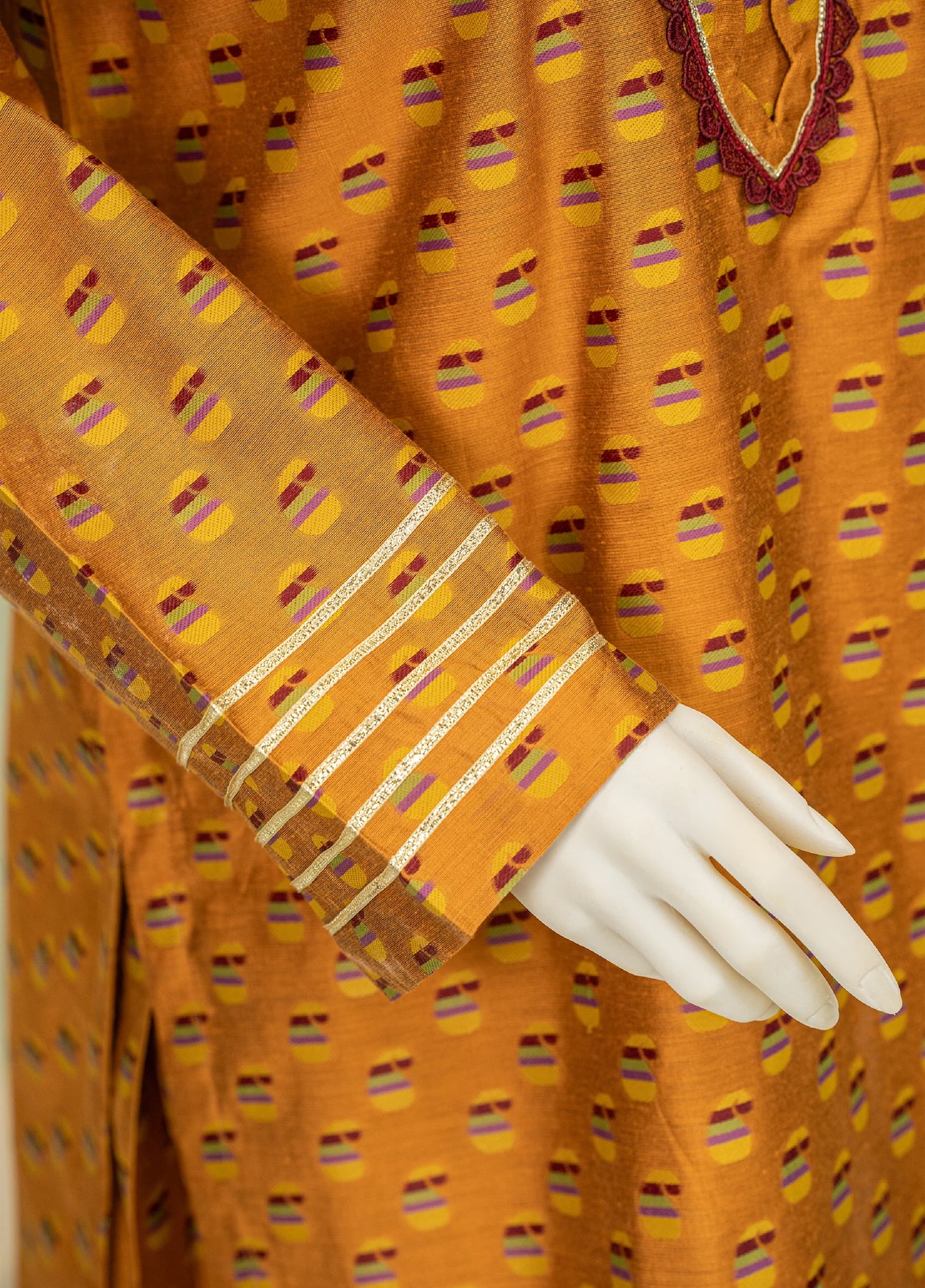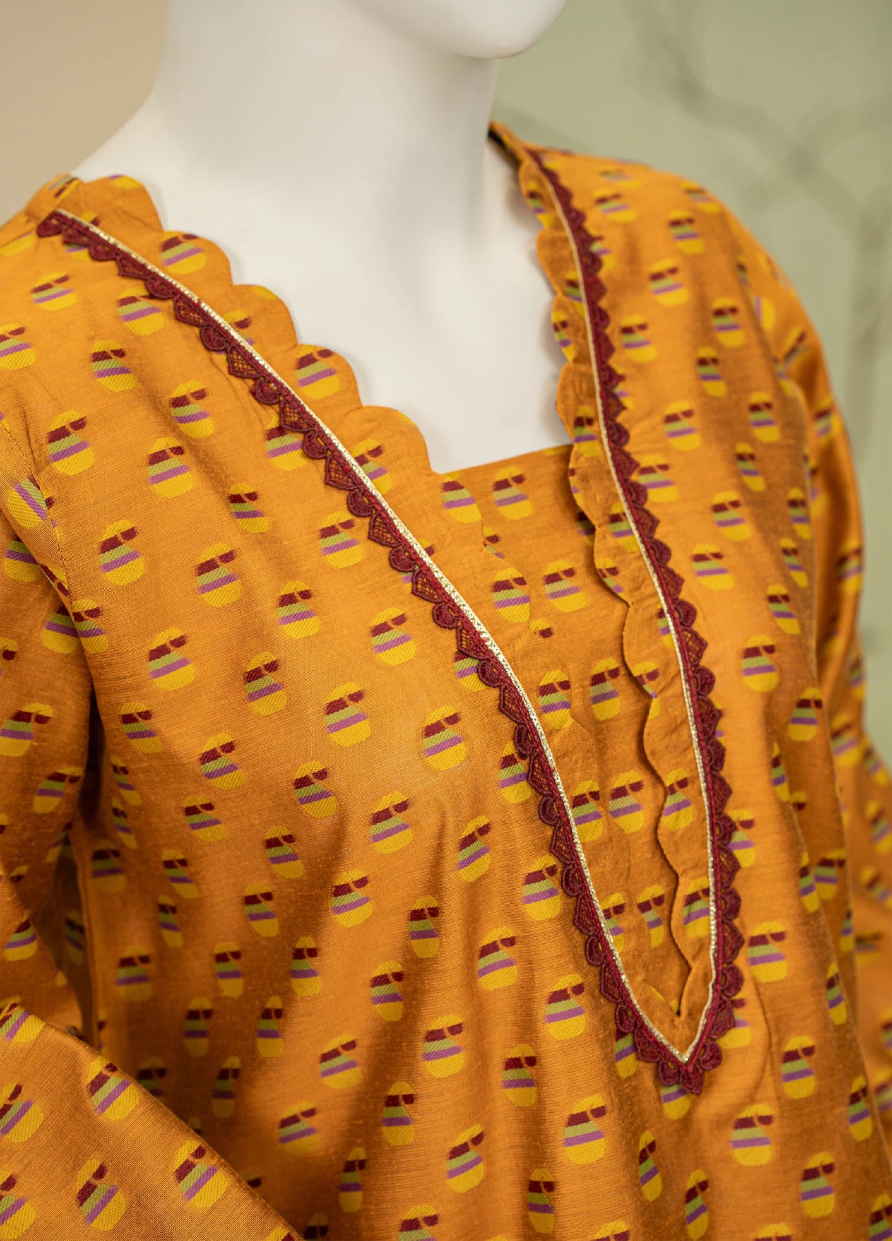 A vibrant mustard co-ord set crafted from soft viscose silk. The kurta features a broad neckline with scalloped detailing and sleeves adorned with gota accents. Paired with a matching shalwar enhanced with gota embellishment at the hem, this ensemble captures a refined Eastern charm.