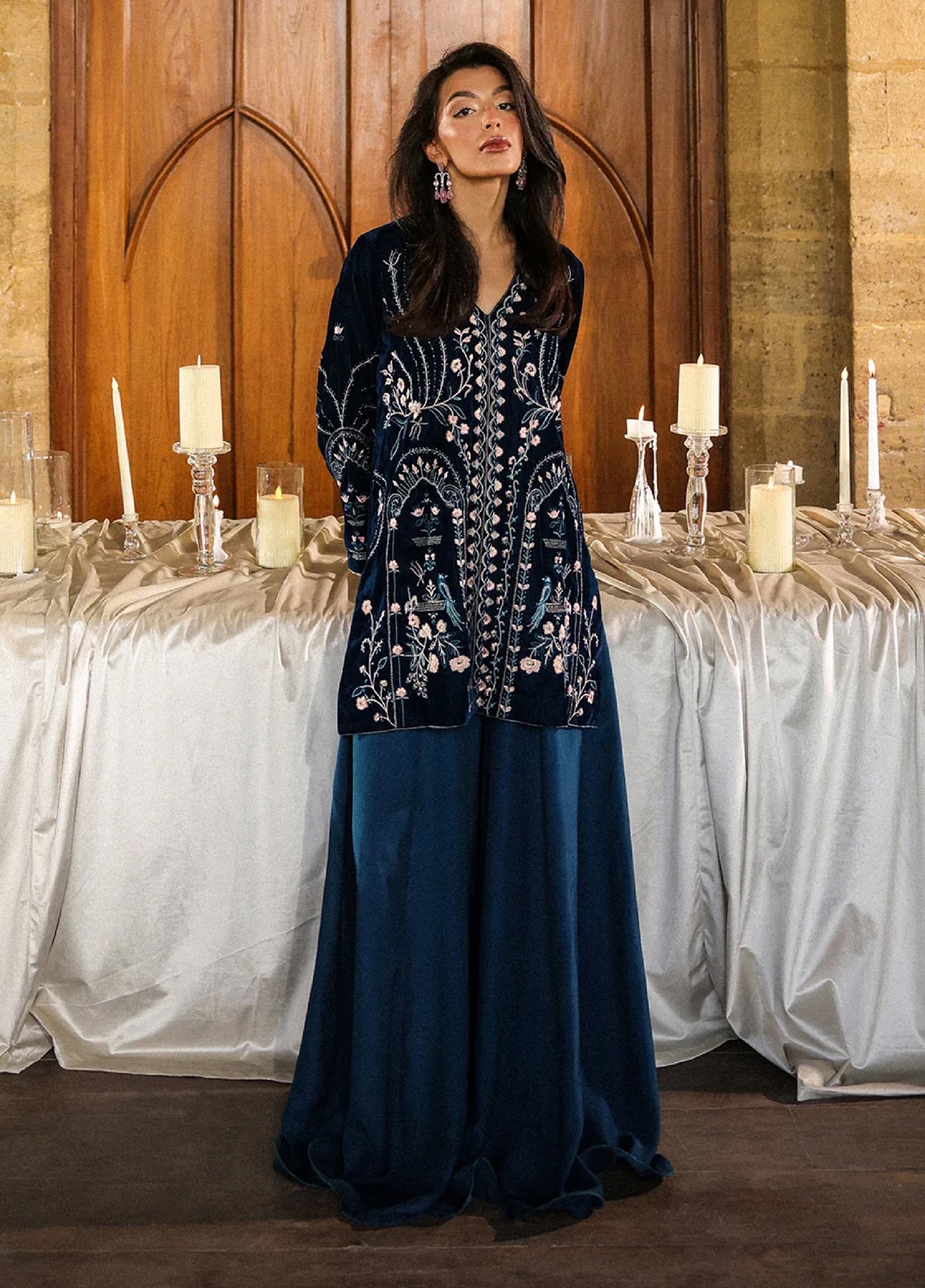 A modern twist on traditional elegance, this sapphire blue velvet 2-piece jacket and dhaka pants set features a heavily embellished front with a graceful floor-length silhouette. The structured top and soft flow of the velvet create a glamorous statement look.