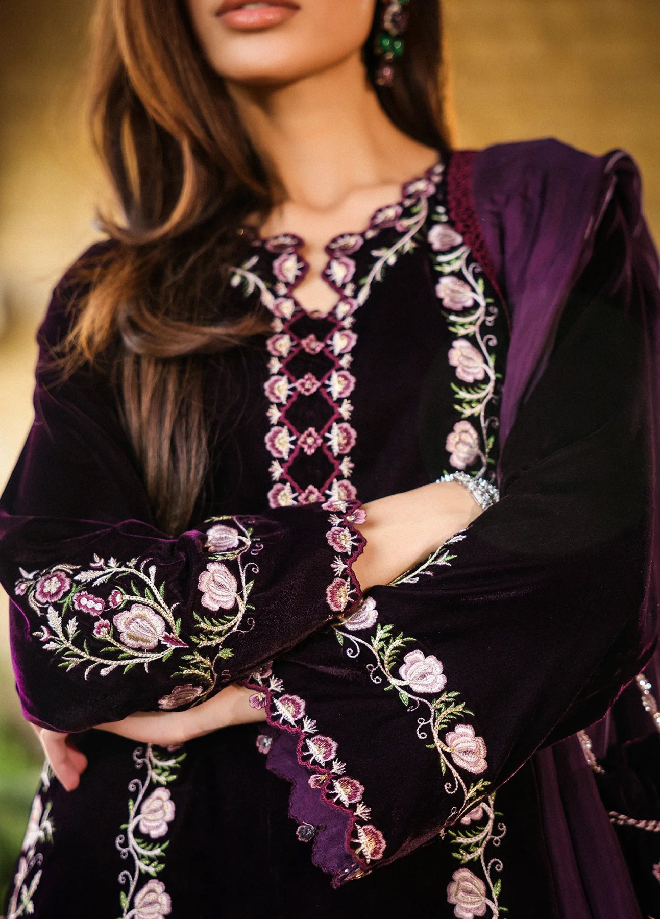 This deep Purple velvet 3-piece suit offers an aura of understated grandeur. The rich dark hue complements the gold embroidery running along the front and sleeves. Paired with gharara-style bottoms and dupatta, creating a sleek and royal outfit for intimate gatherings or elegant soirées.