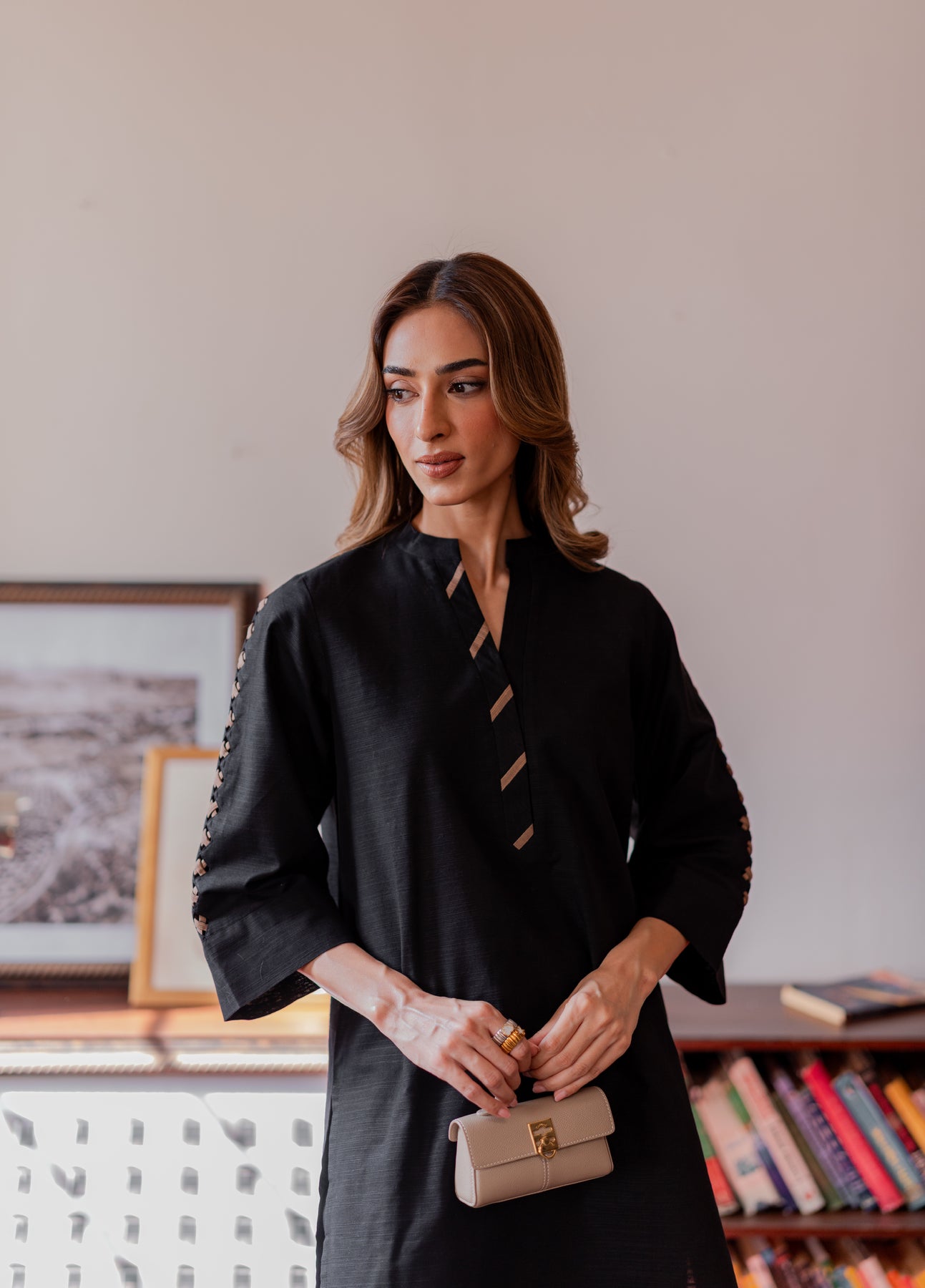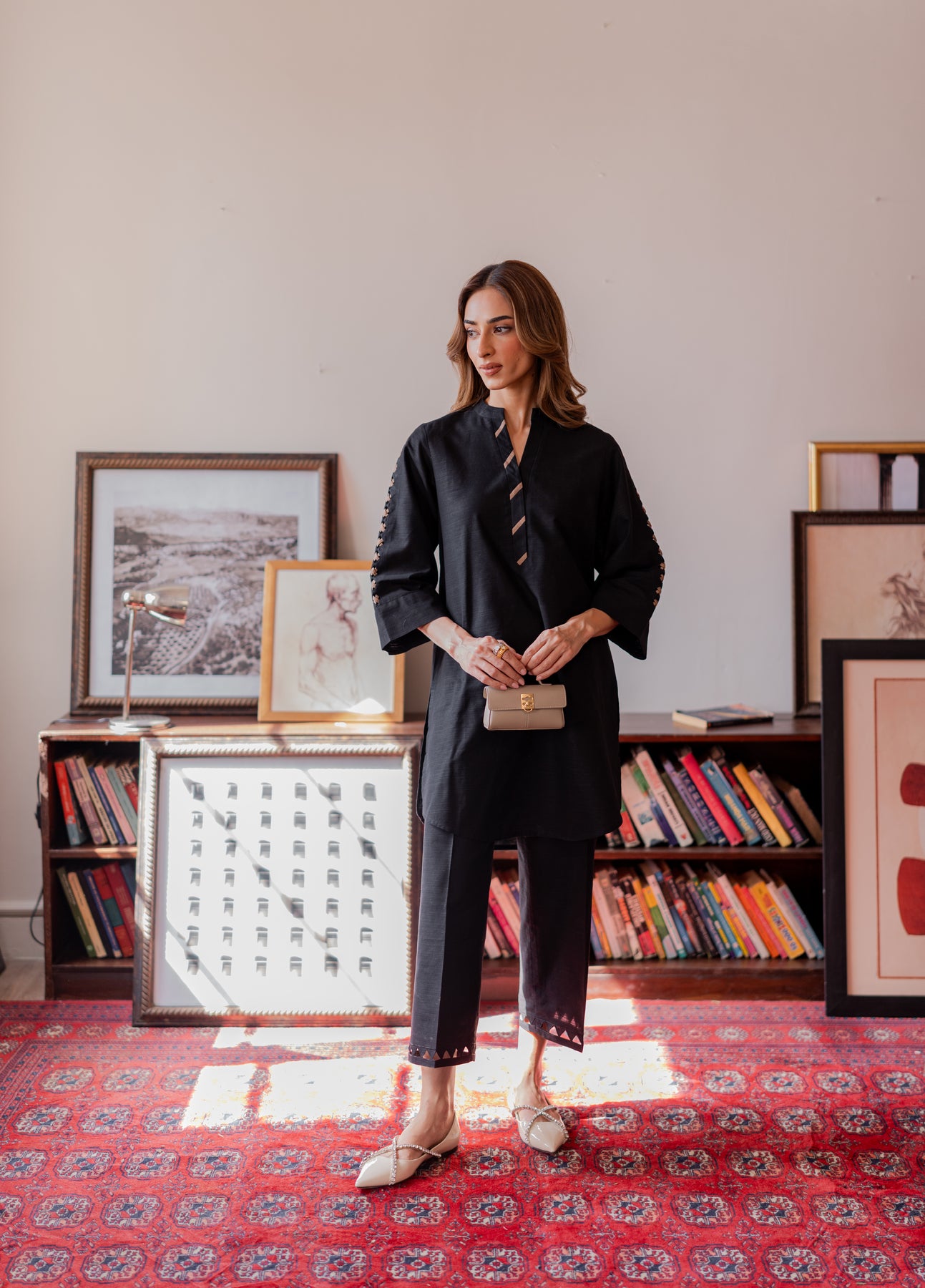 A sleek black co-ord set exuding refined minimalism. The shirt features a V-slit neckline with metallic accents and ladder lace detailing on the sleeves, paired with straight trousers adorned with cutwork lace hems for a touch of understated sophistication.