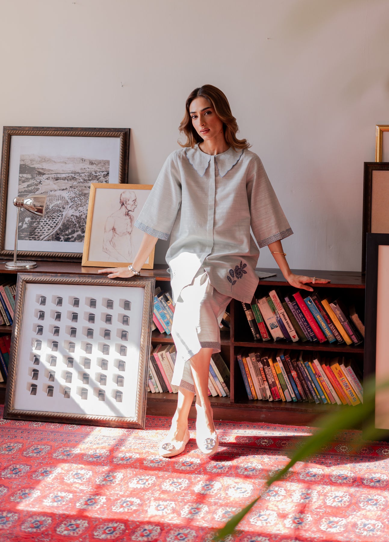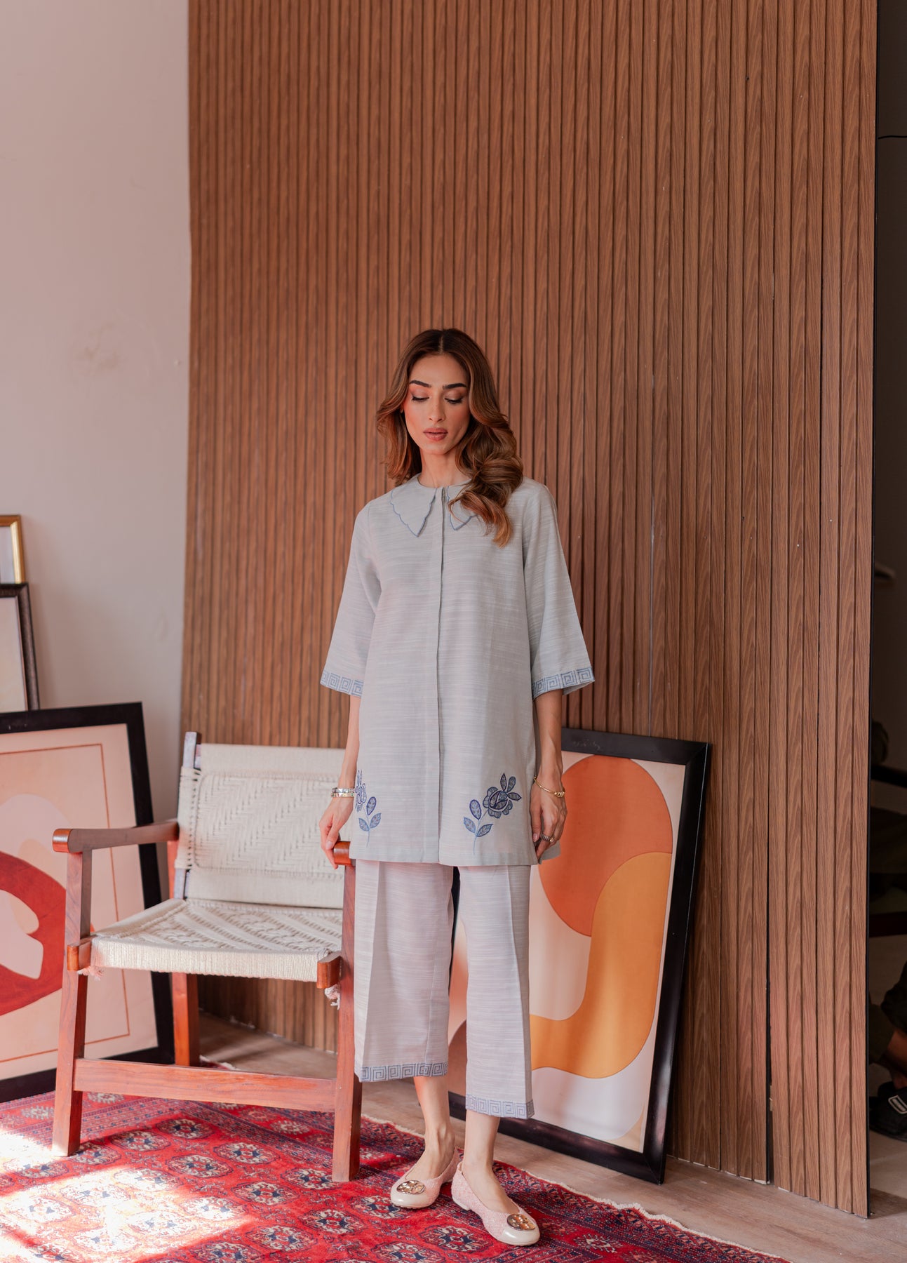 The shirt features a soft pleated front with a contemporary statement collar and intricate tonal embroidery of stylized leaves near the hem and sleeve cuffs, adding a refreshing artisanal touch. The straight trousers are finished with coordinating geometric embroidered borders, completing the refined aesthetic.