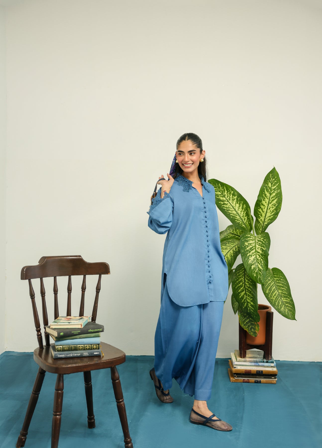 This chic outfit features a relaxed button-down shirt with intricate lace detailing on the collar and cuffs. Itβs paired with wide-hem pants creating a clean, modern silhouette with a hint of elegance - perfect for a refined everyday style.