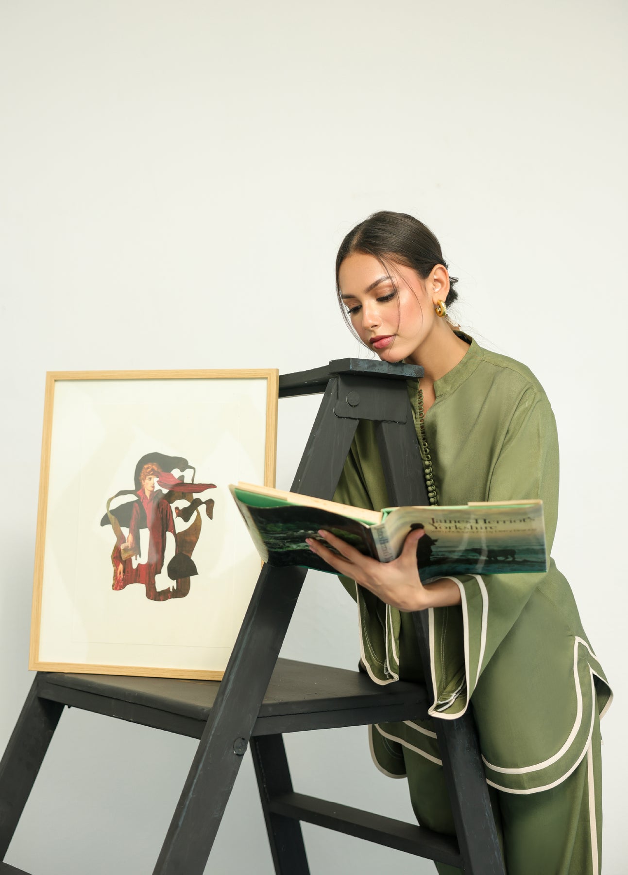 This elegant outfit is a two-piece co-ord set in a soft olive green hue. The design is unified and beautifully defined by the crisp, stark contrast of cream-colored piping that sharply outlines the edges of the tunic's cuffs and hem, and runs distinctively along the sides and hems of the trousers. This strong visual line against the muted green fabric provides a modern and polished aesthetic. This ensemble is perfect for a stylish, modern daytime look.