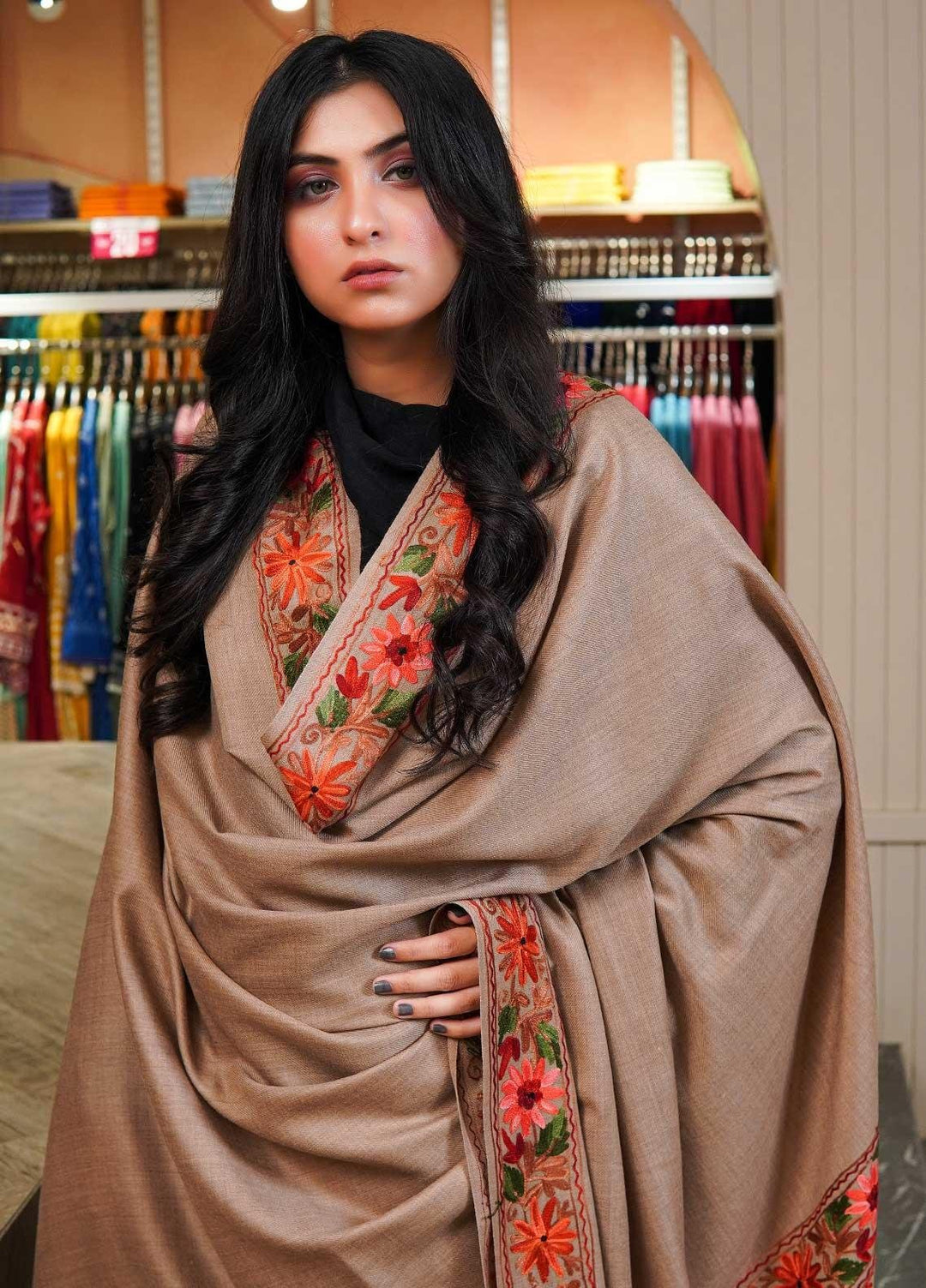 Sanaulla Exclusive Range Pashmina Shawls Multi Palla Emb C KPS-40 Fawn - Pashmina Shawls