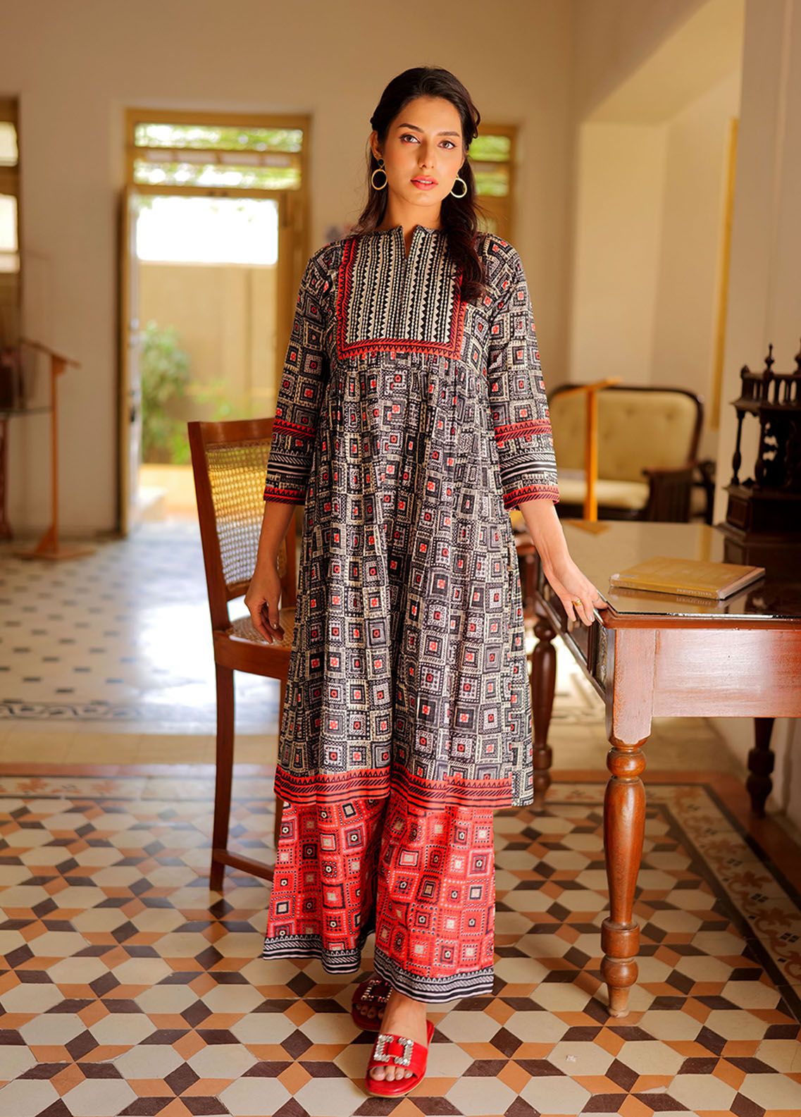 A line style shirt with pleats and embroidery around neckline paired with contrast printed pants