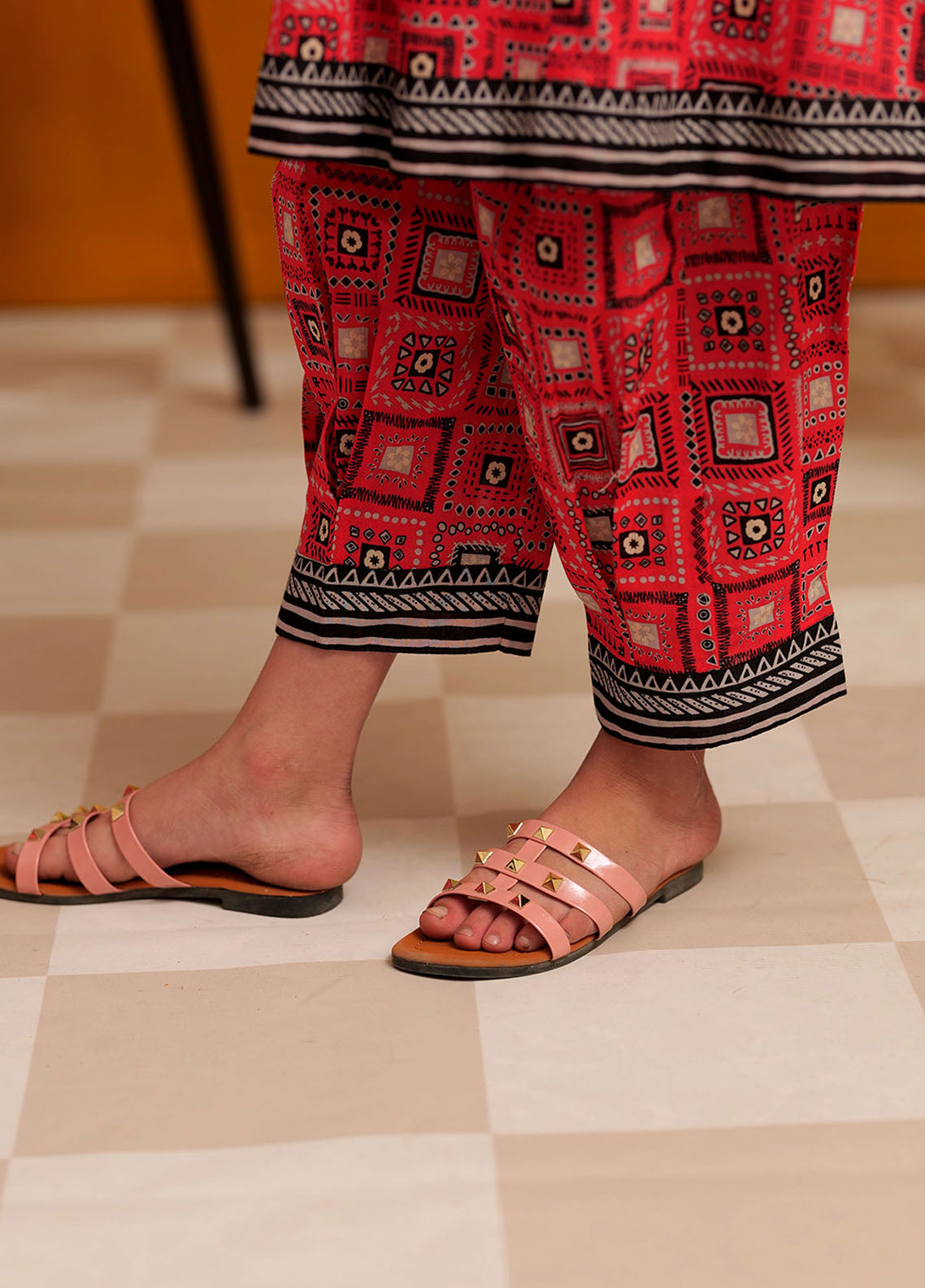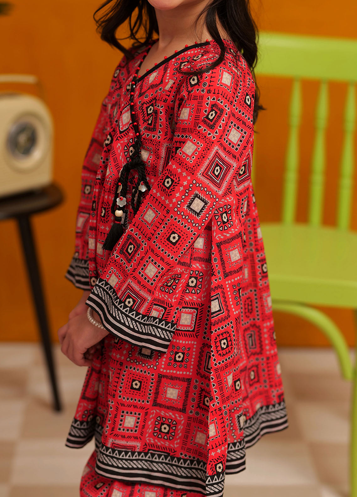 Angarkha style shirt with gathers embellished with dori and beads paired with stylish printed pants