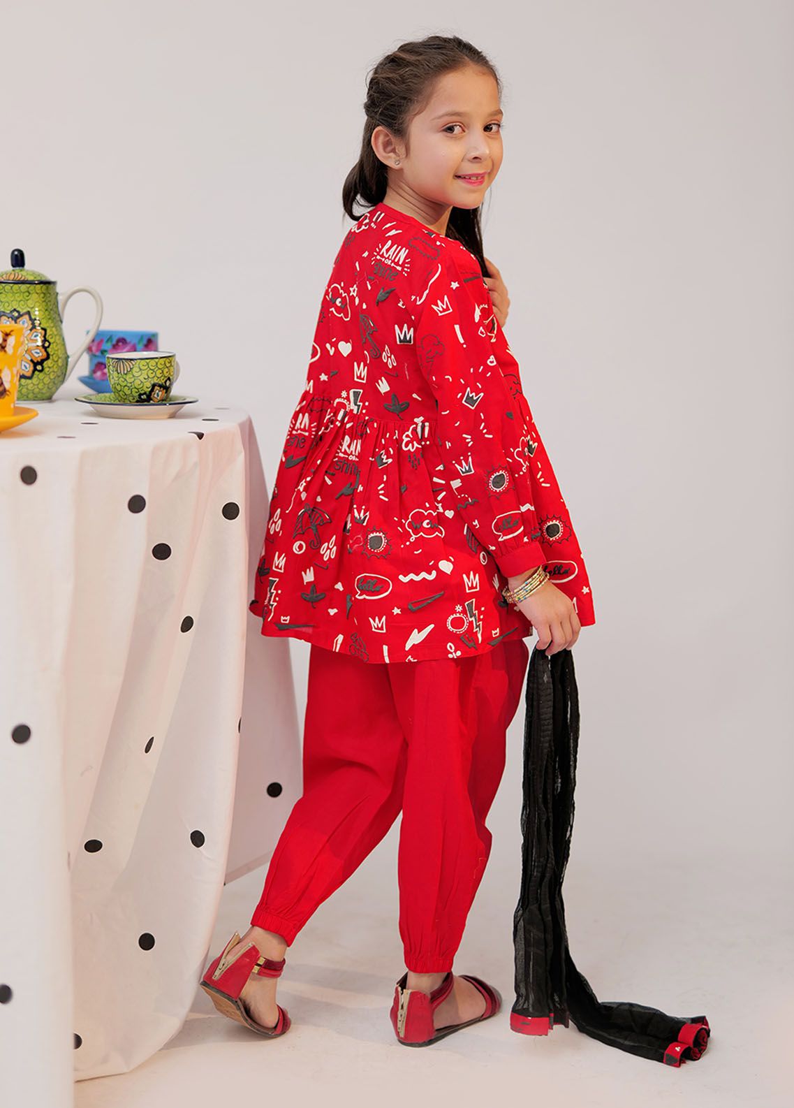 Front open short peplum frock having full cuff sleeves Finished with buttons on front placket and sleeve cuffs Paired with stylized elasticated bottoms and contrasting chunri dupatta br data mce fragment 1