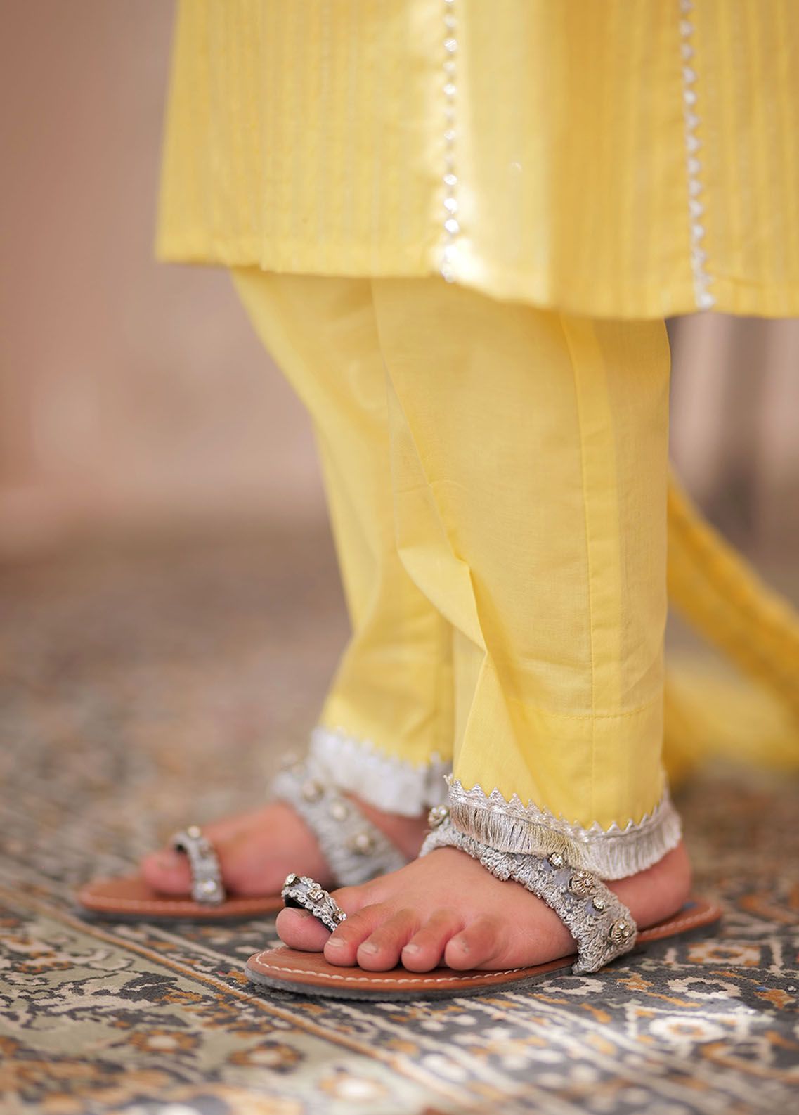 A line panelled kurta with lace finishing on front panels and on sleeves embellished with buttons paired with straight pants with lace finishing and crushed duppatta br data mce fragment 1