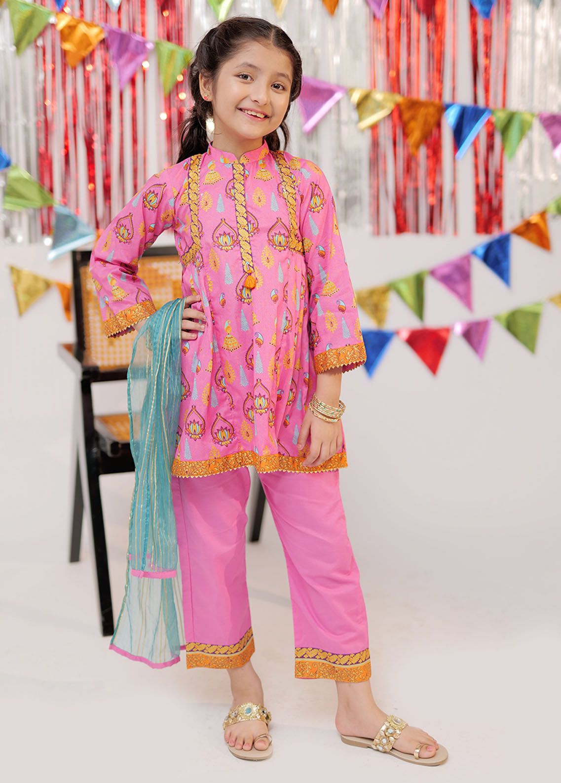 A line collar shirt with side pleats on front and back Finished with contrasting border on front sleeves daaman and bottoms Embellished with fancy lace beads and tassels Paired with straight pants and a contrasting dupatta br data mce fragment 1