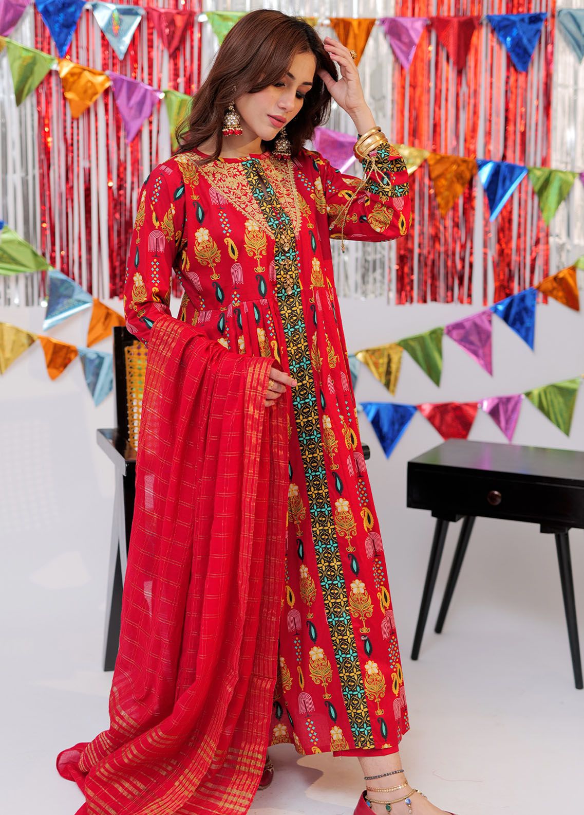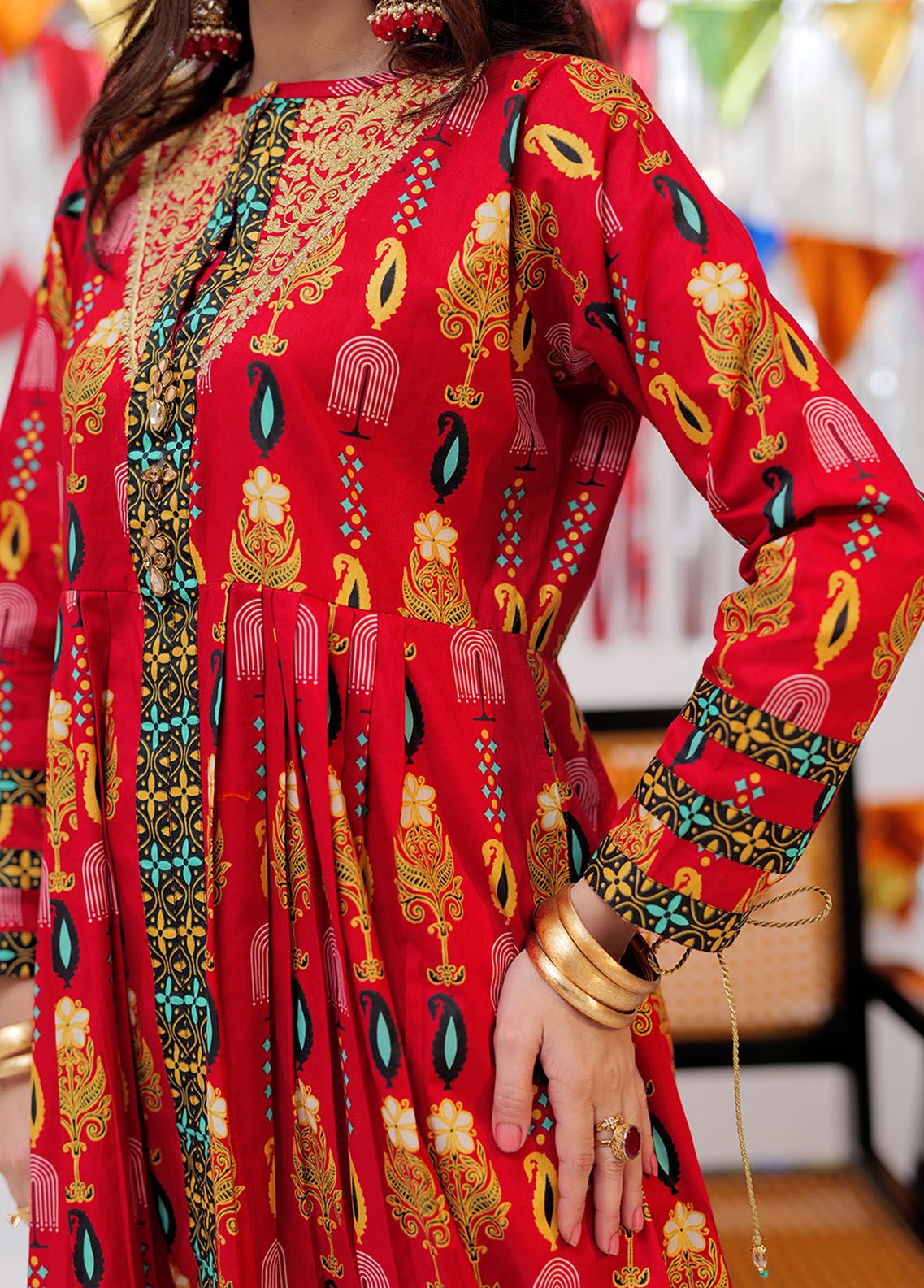 Long body frock with pleats on front and back Fancy embroidery on neckline Finished with contrasting border on front and sleeves Embellished with fancy dori on sleeves Paired with straight fitted pants and fancy dupatta